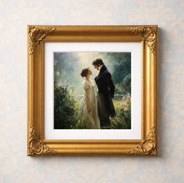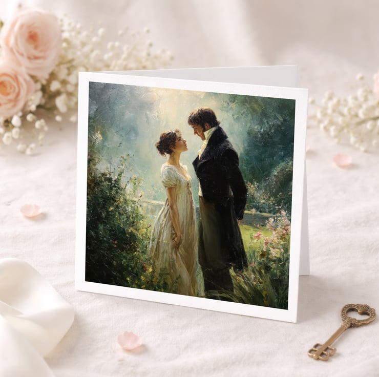 Soft brushstrokes, gentle light, and a classic Regency-era mood bring this iconic couple to life, making the card perfect for book lovers, romantics, and admirers of Jane Austen. The design is set within a clean white border on a square card, creating an elegant, gallery-style look.