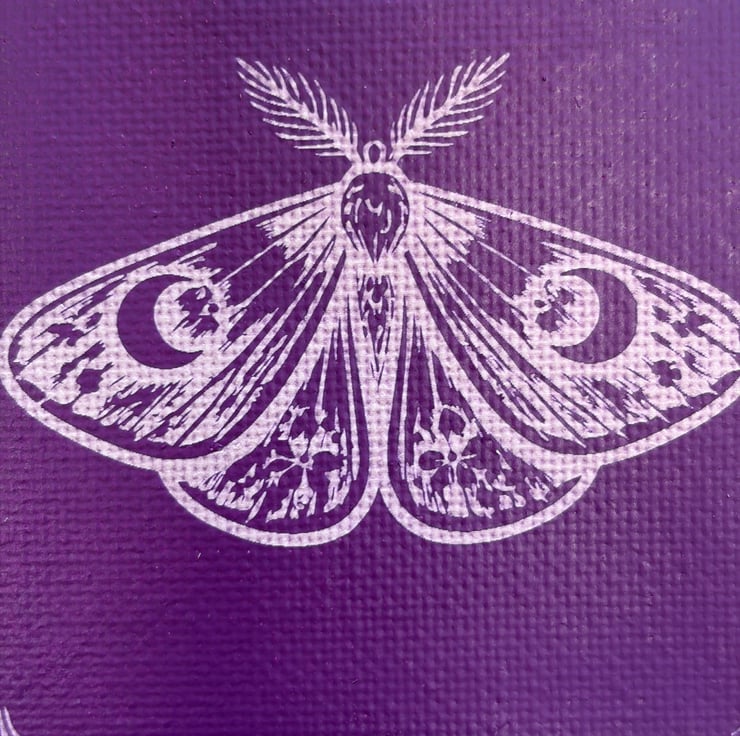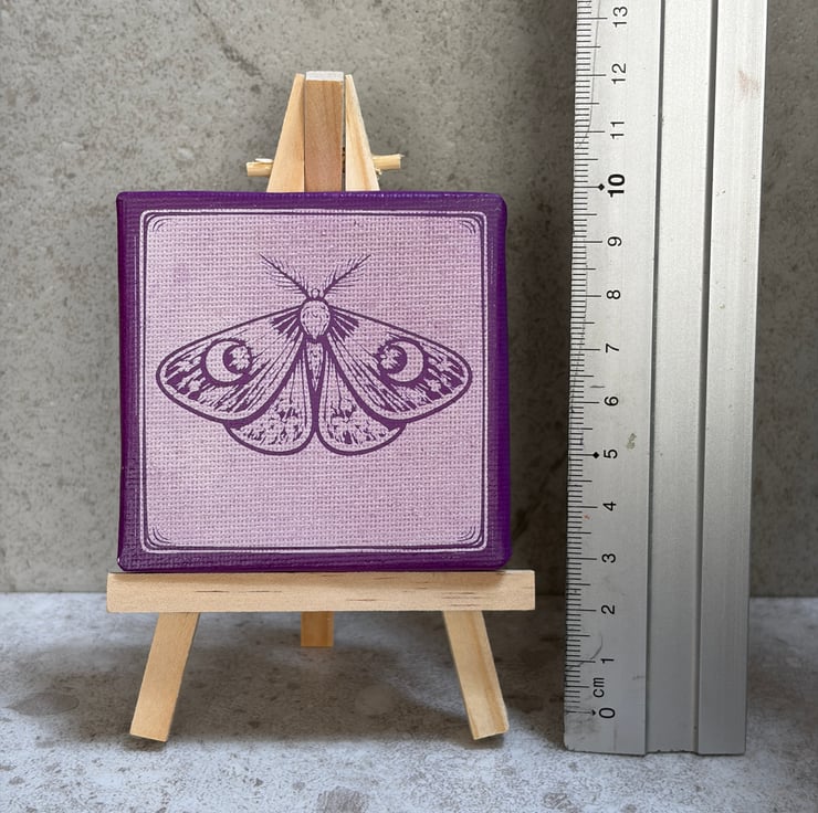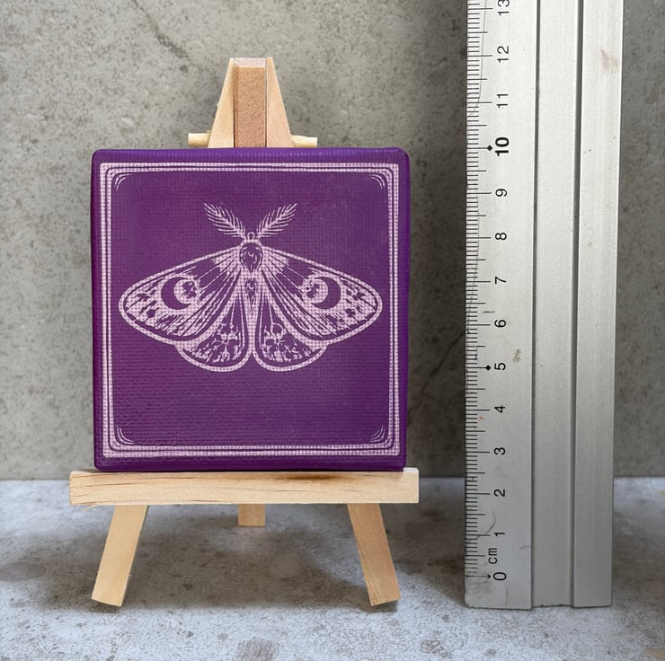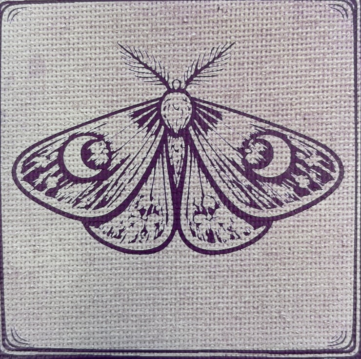 This 7.5cm square canvas features my original moth design, inspired by traditional folk illustration and vintage woodcut printmaking. Crescent moons and delicate botanical details are engraved into the wings, giving the piece a subtle mystical feel.