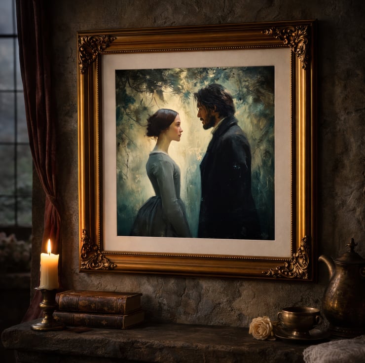 Bring the haunting beauty and emotional depth of Jane Eyre into your home with this fine art print, infused with rich oil-painting style detail and vintage-romantic charm: