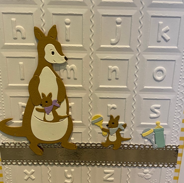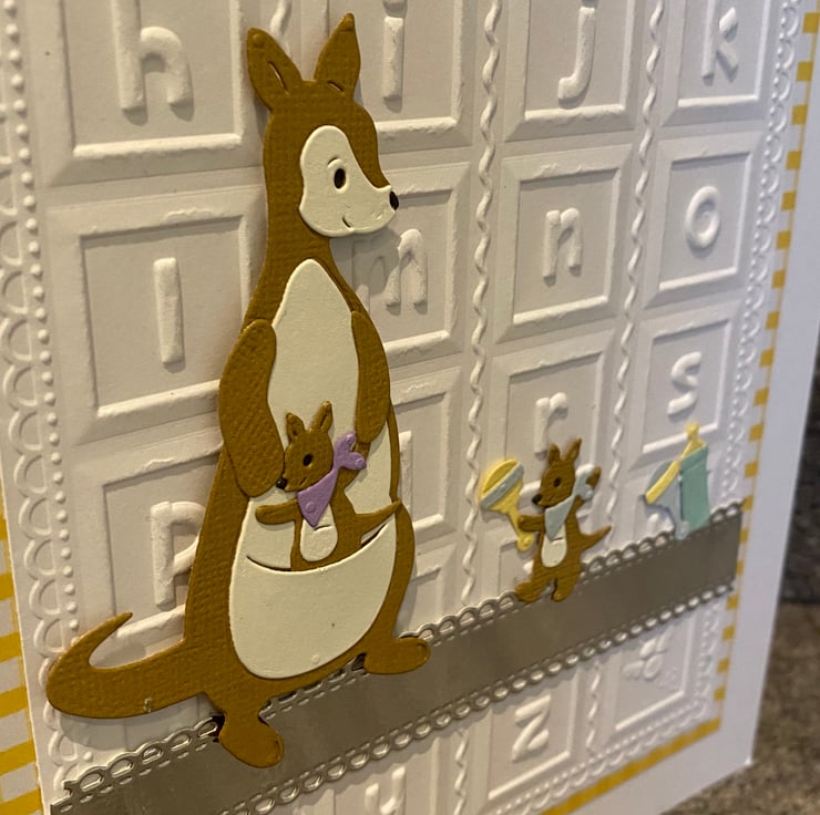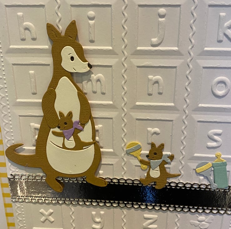 This card was inspired by the gentle, nurturing bond between Kanga and Roo the perfect pair to welcome a new little one. The embossed alphabet background adds a soft nursery feel, while touches of gold bring a sense of celebration to such a special moment.