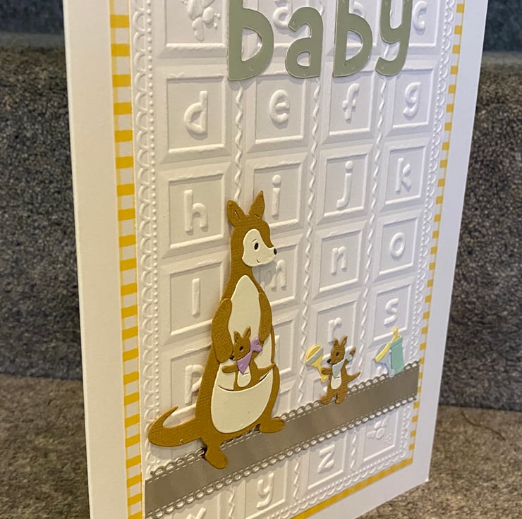 Welcome a precious new arrival with this adorable handmade Kanga & Roo baby card. Created in soft, neutral tones and layered with luxurious gold opulent cardstock, it’s a beautifully special way to celebrate a new little one.