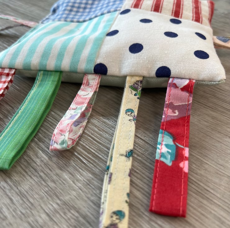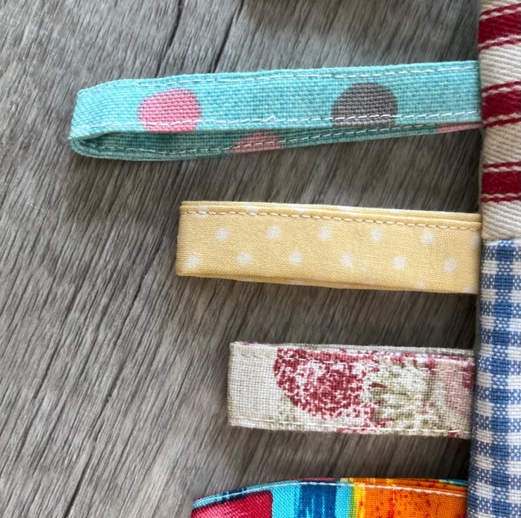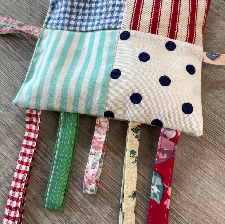 The top is made of 4 brightly coloured squares in cheery green, blue, white and red patterns of checks, spots and stripes. The back has a gentle light green polka dot. The tags are of different widths, patterns and colours.