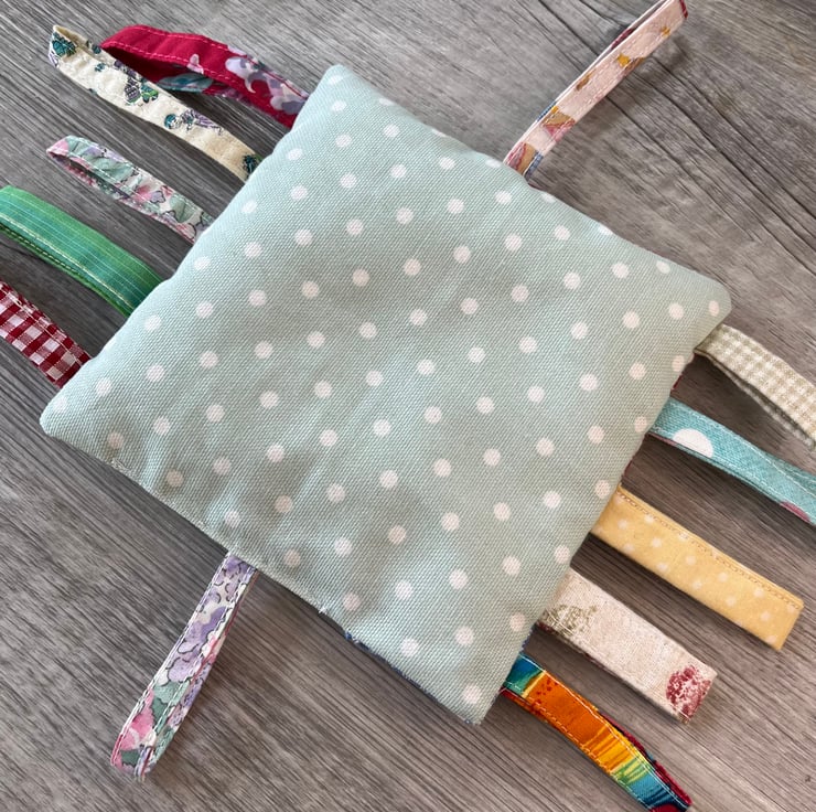 This item has been made with those living with dementia or Alzheimer's in mind. The tags on the sides are perfect to fiddle with. The main part of the piece sits nicely on a lap. It is gently filled with poly beads that can be squished and moved around to entertain and occupy.