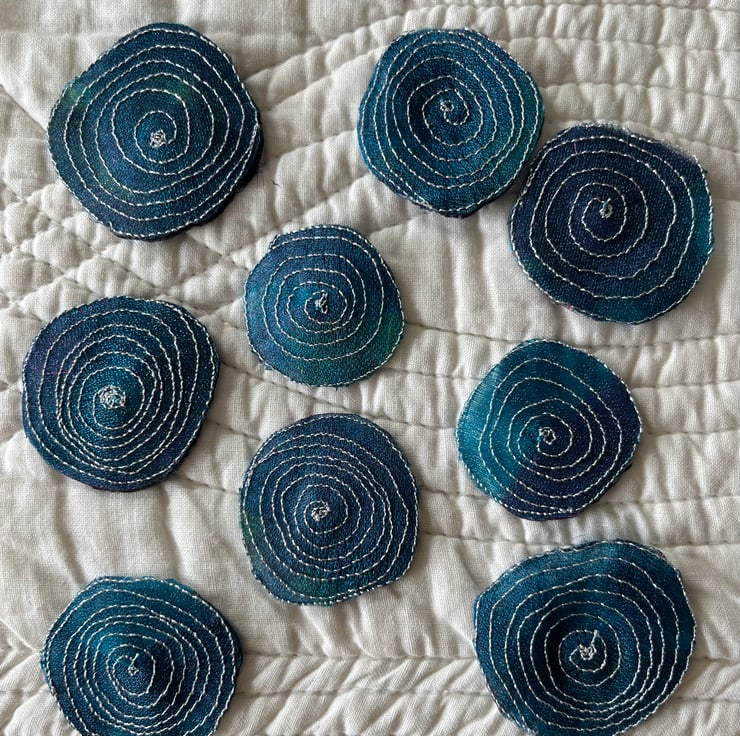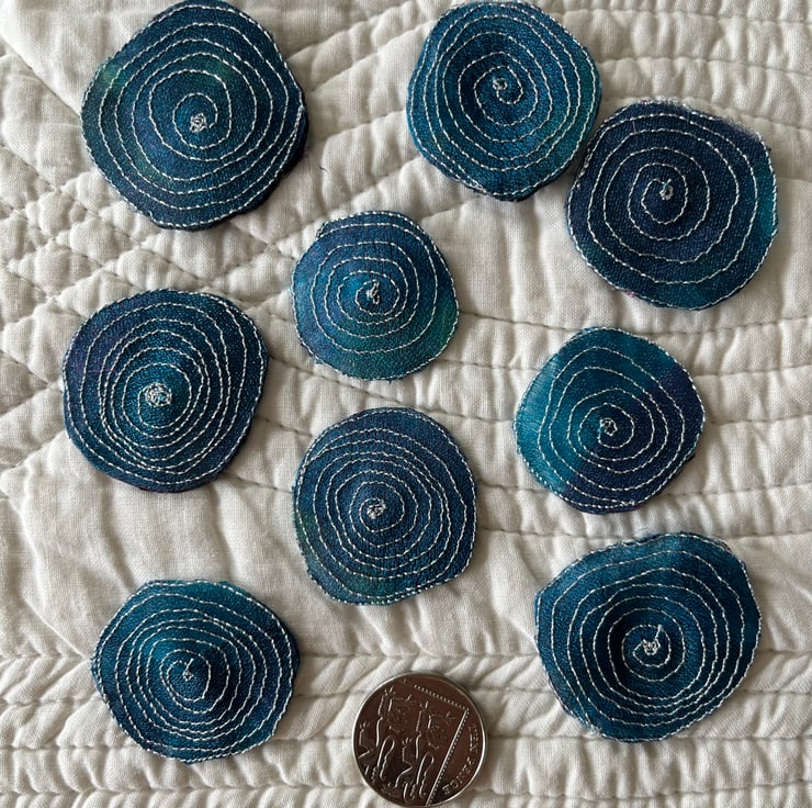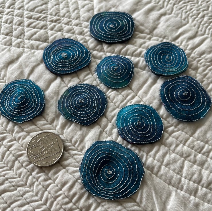 This pack of 9 spiral, circle embellishments have been made by using free motion embroidery techniques - drawing with the sewing machine. Each one is slightly different from another, giving them a quirky, individual look. They are stitched with silver metallic thread to add a subtle sparkle.