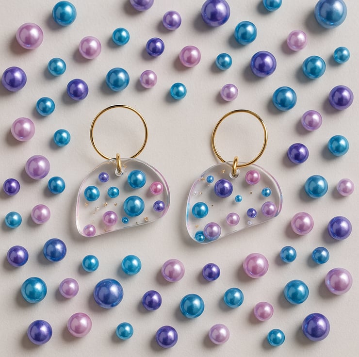 These handmade blue and purple pearl resin earrings feature shimmering pearl-style beads suspended inside crystal-clear resin, finished in an organic asymmetrical shape.