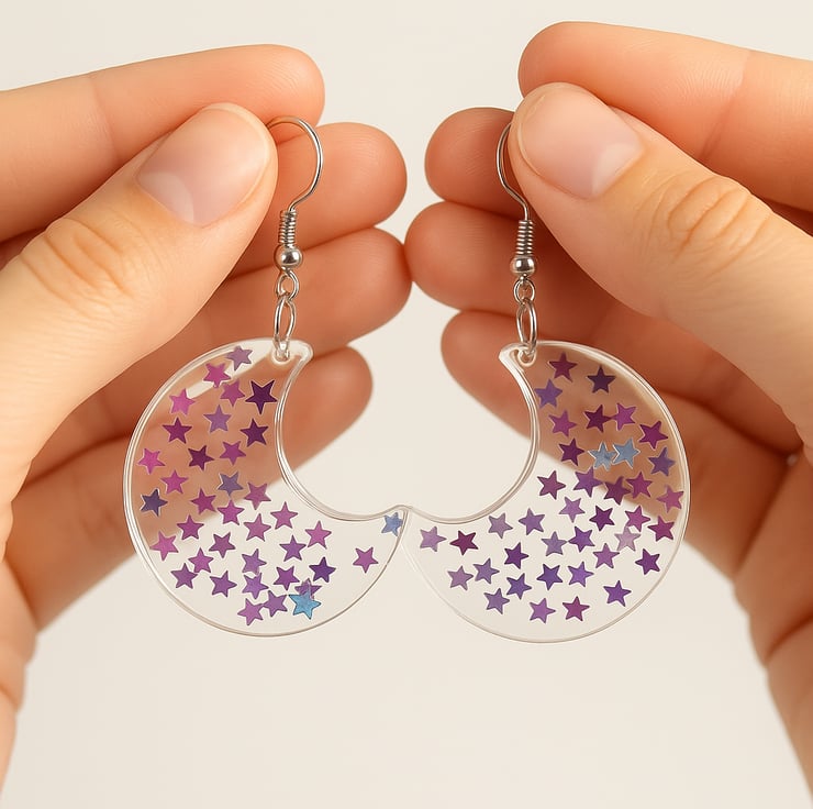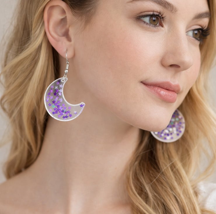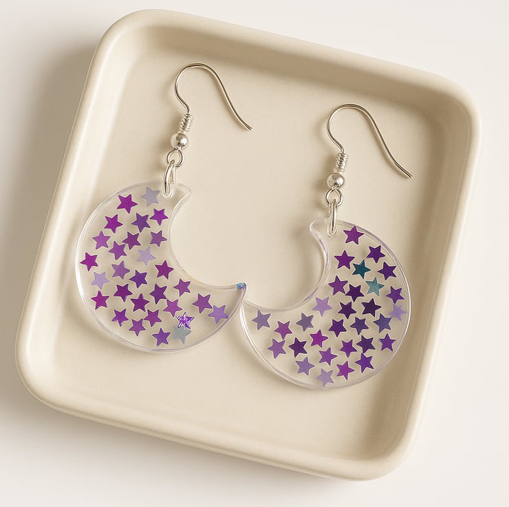 These handmade crescent moon resin earrings feature shimmering purple holographic star confetti suspended inside crystal-clear resin. Lightweight and eye-catching, they offer a magical celestial look that’s perfect for everyday wear, festival outfits, or as a unique handmade gift from a UK maker.
