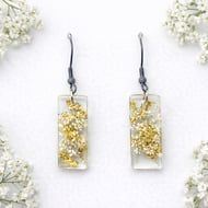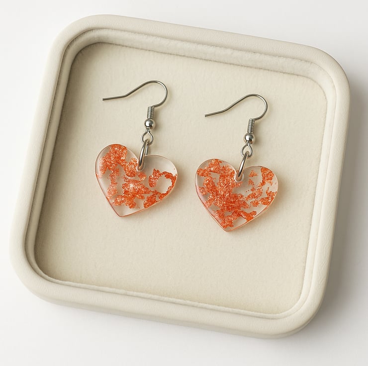 These handmade rose gold leaf heart resin earrings feature shimmering metallic flakes suspended inside crystal-clear resin, creating a soft, romantic sparkle. Lightweight and comfortable to wear, they’re perfect for everyday styling, date nights, special occasions, or as a thoughtful handmade gift from a UK maker.