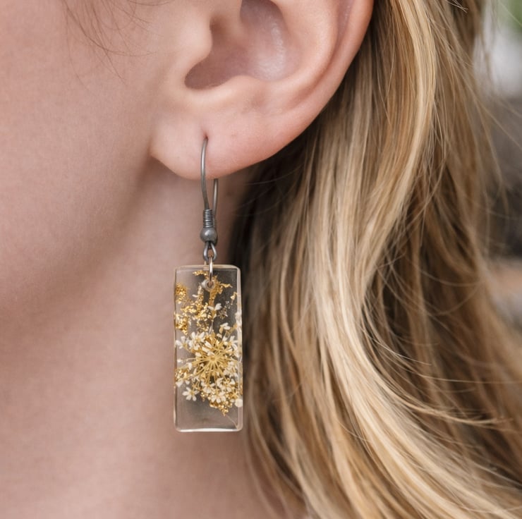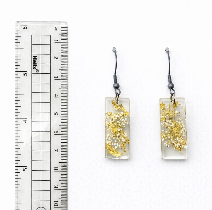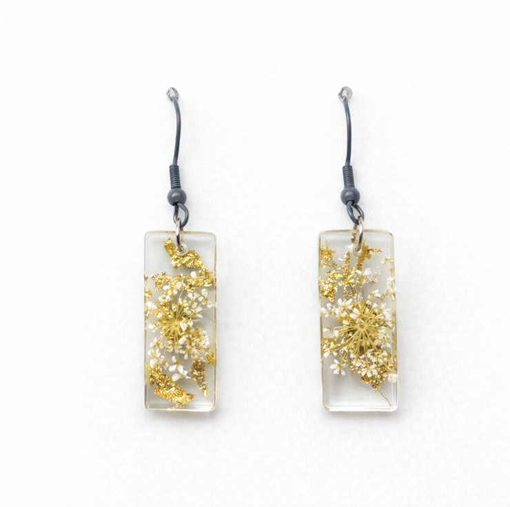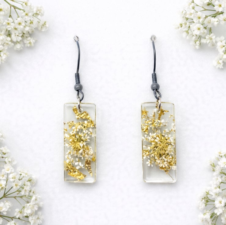I love working with real flowers and gold leaf. These handmade small slim rectangle resin earrings feature delicate white flowers and subtle gold leaf flakes, preserved in crystal-clear resin. Lightweight and comfortable to wear, they offer a clean minimalist botanical look with gentle shimmer — perfect for everyday elegance, bridal styling, or as a thoughtful handmade gift from a UK maker.