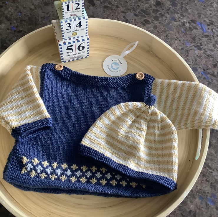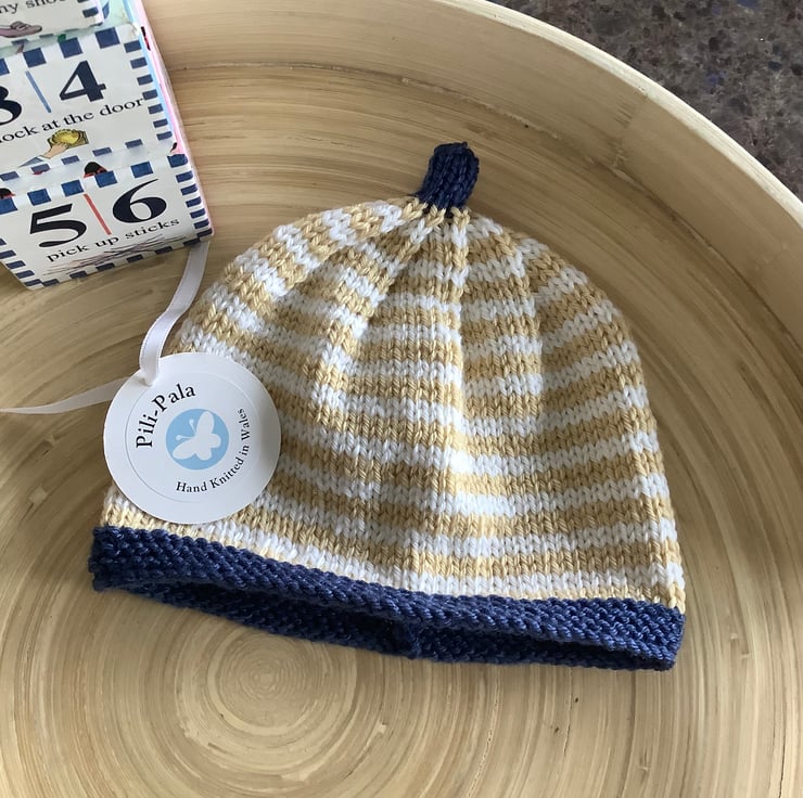 This sweet little beanie was hand knitted by me in a soft cashmere blend wool. It is for 0-6 months. It has a garter stitch edge and a little top knot. It is knitted in yellow and cream stripes with a blue edge and top knot.