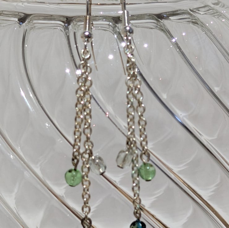 These beautiful dangle earrings are made from silver plated chain with green and clear faceted glass crystals. Their understated elegance makes these perfect for both days and evening wear.