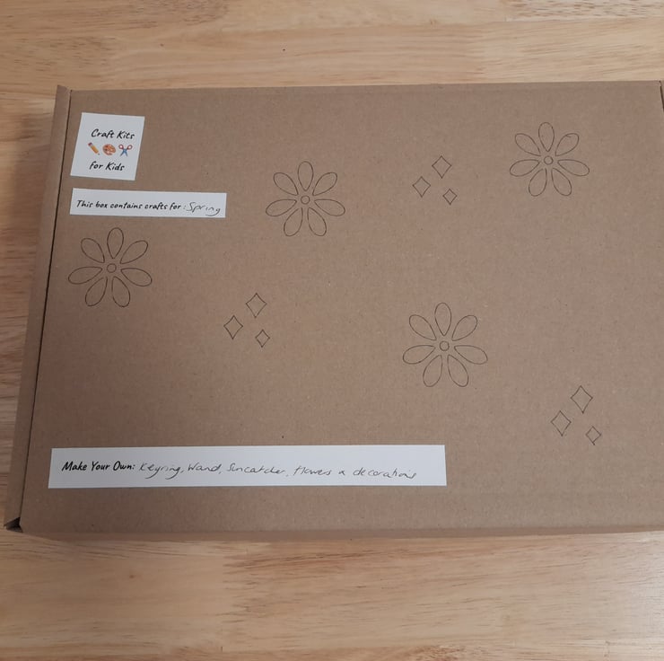 Seasonal Spring Craft Box for children featuring 5 different crafts of make your own keyring, suncatcher, salt dough decorations, wand and pipe cleaner flowers. The box and wrapping can be used for further crafts.