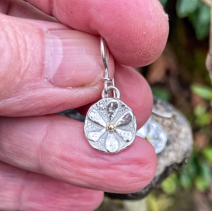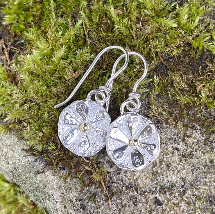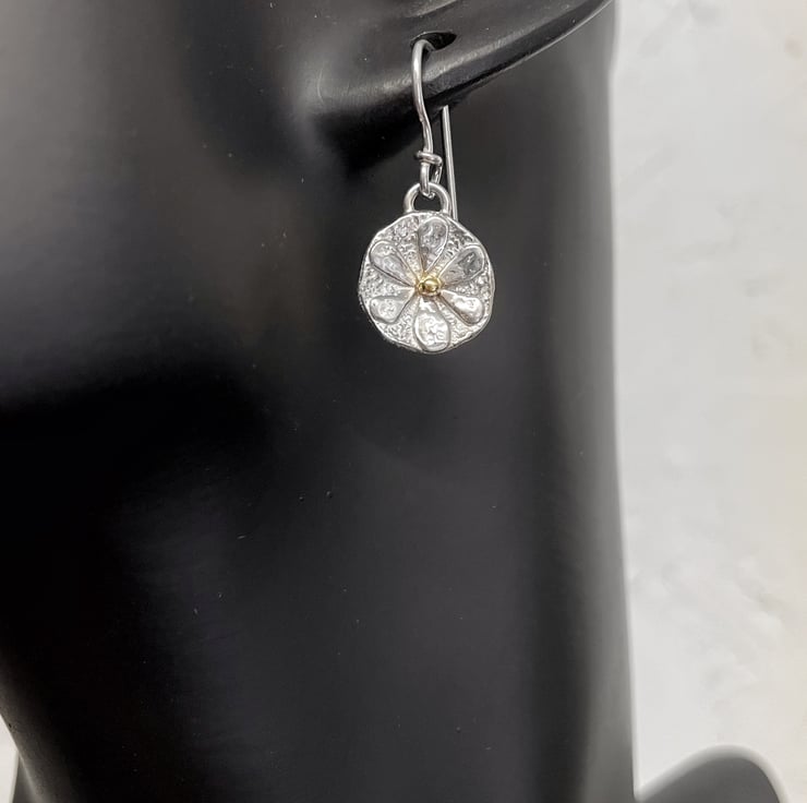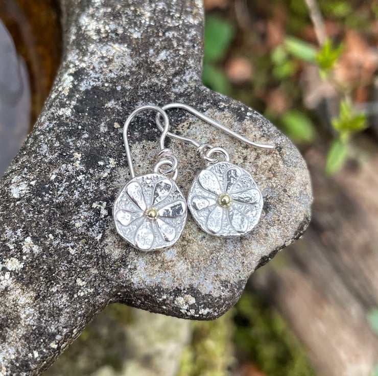 Small textured silver stylised flower earrings with 18ct gold centres.