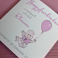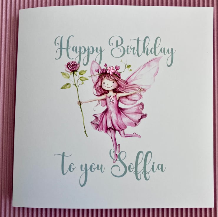 A square white greetings card featuring a the words ‘Happy Birthday (NAME)’ featuring a lovely watercolour illustration of a pink fairy holding a rose and decorated with pink diamanté gems.