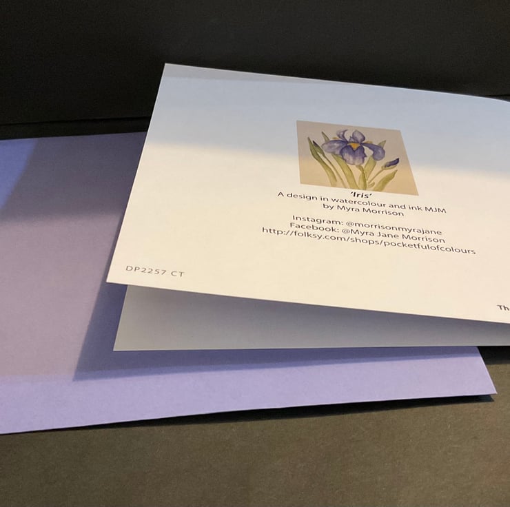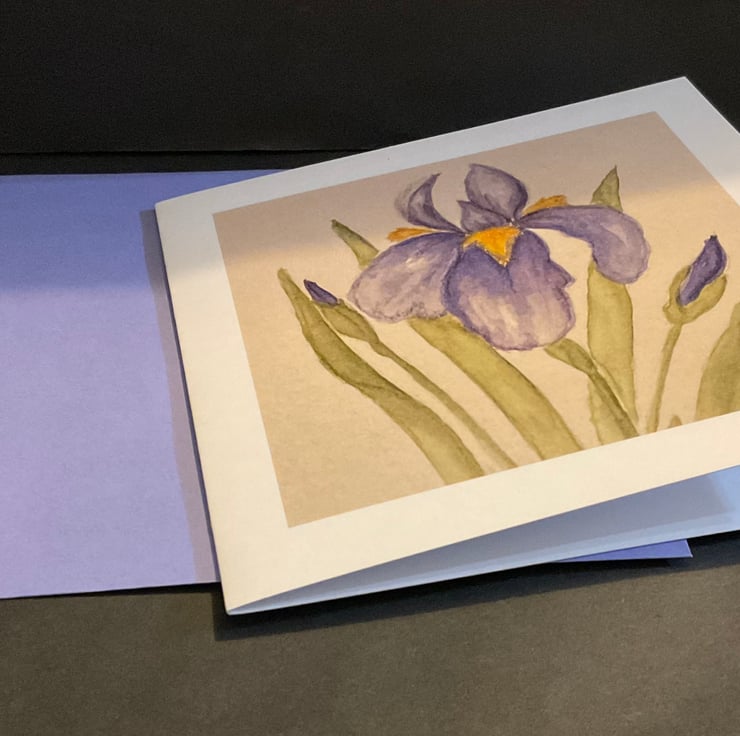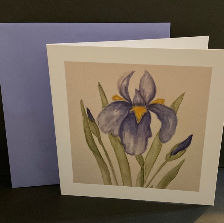 This is an original design of an Iris in watercolour and ink .This greetings card is blank inside for your own message . . The card would be suitable for a birthday , friend ,relative , as a thankyou card , or maybe for a keen gardener