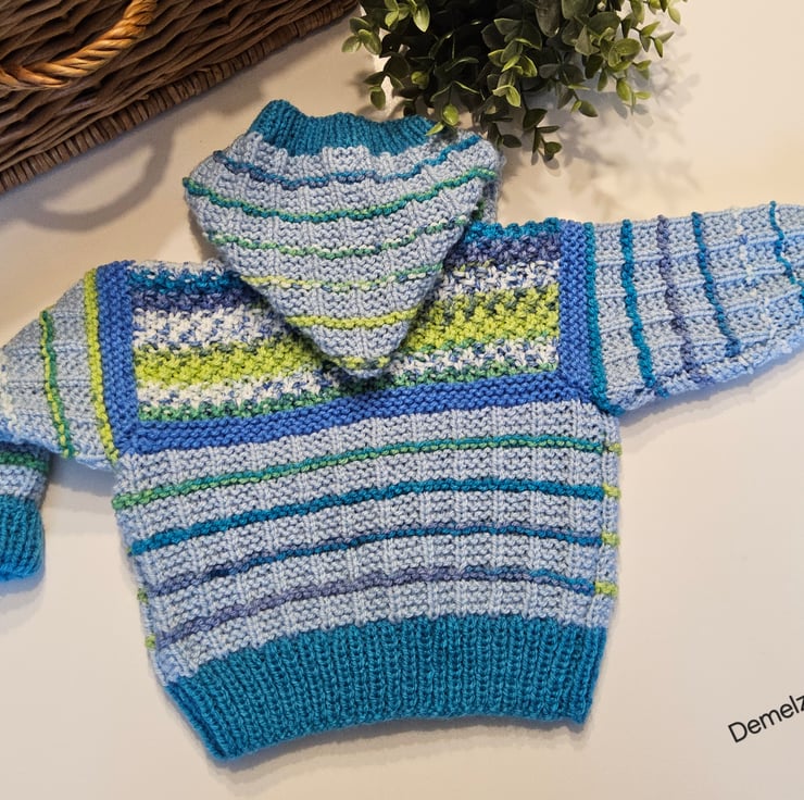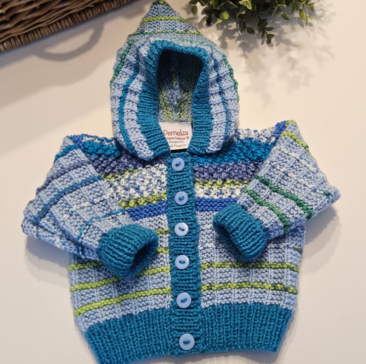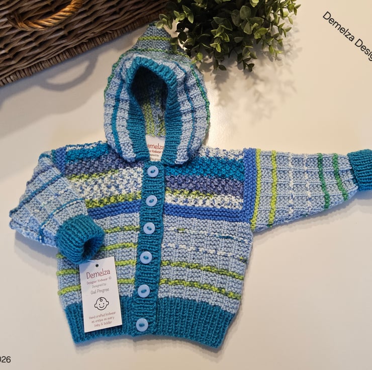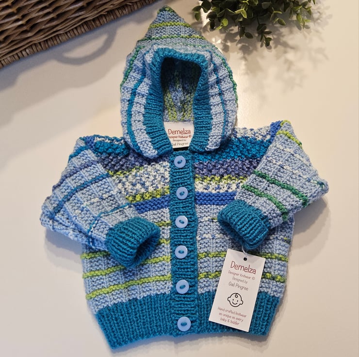 A practical designer baby hand knitted textured hooded jacket for those seeking total individuality. It will make a perfect genuine designer baby gift for a new born, baby shower, expecting congratulations gift or for perants looking for quality unique baby knitwear for their little one.