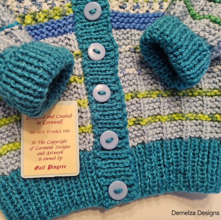 Baby knitwear is designed and hand crafted by Demelza Designs in Cornwall meeting UK baby safety standards, Only branded premuim acylic, acrylic/natural fibre blends or pure natural fibre yarns are used in baby knitwear which conforms to BS984/76 standards.