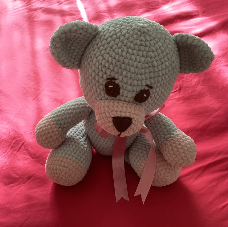 The Teddies are approximately 17 inches (44cm) tall and are made from new Chenille yarn, they are stuffed with Polyester Hi-Loft Toy Stuffing. They have crochet eyes and the legs are moveable. One has a Pink nose and paws and the other has Blue.
