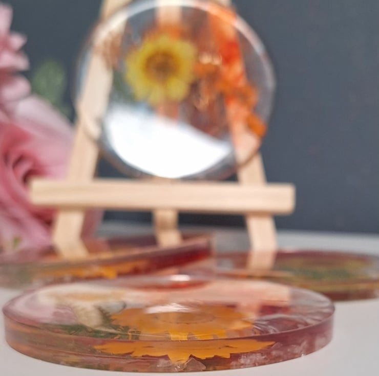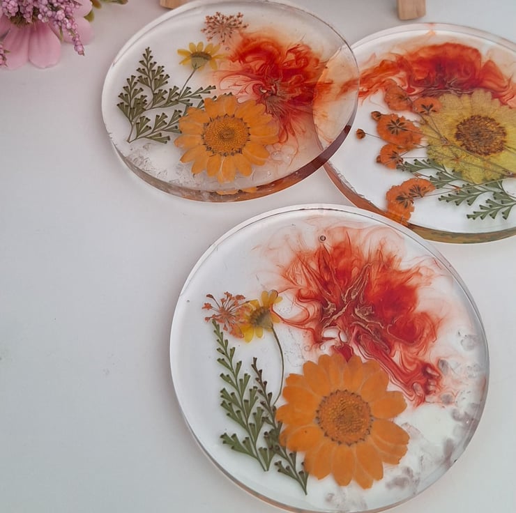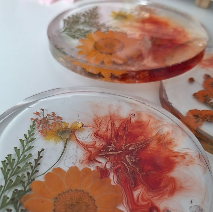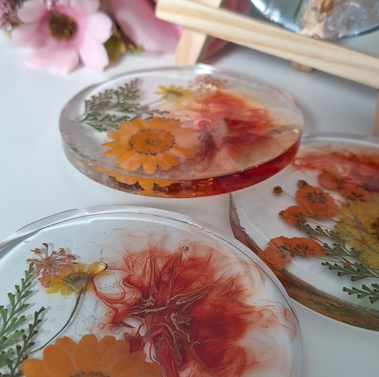 These Botanical Swirl Coasters are the result of one of those creative bursts, a mix of fiery oranges, reds and golds that found their own way through the resin to create these organic patterns.