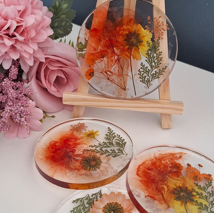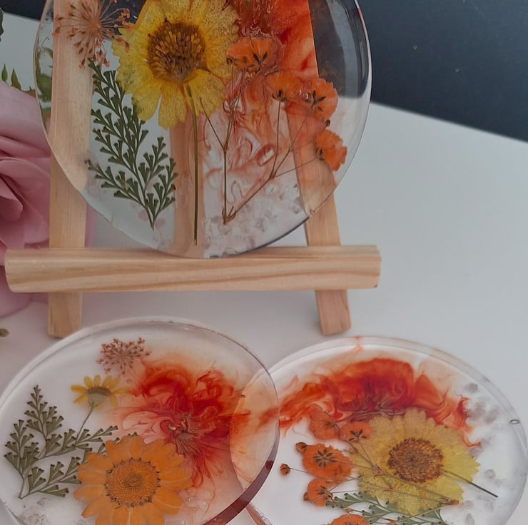 Inspired by the warm tones of nature, these "Botanical Swirl" coasters feature botanical flowers a striking fusion of fiery oranges and reds, accented with shimmering gold highlights that catch the light beautifully.