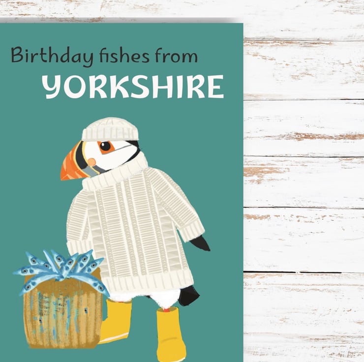 Send a proper Yorkshire greeting with this little puffin in their favourite gansey.