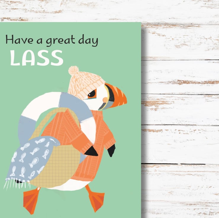 Send a proper Yorkshire greeting with this little puffin in her favourite gansey and bobble hat essential for anyone swimming in the North Sea.