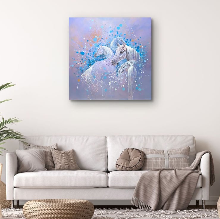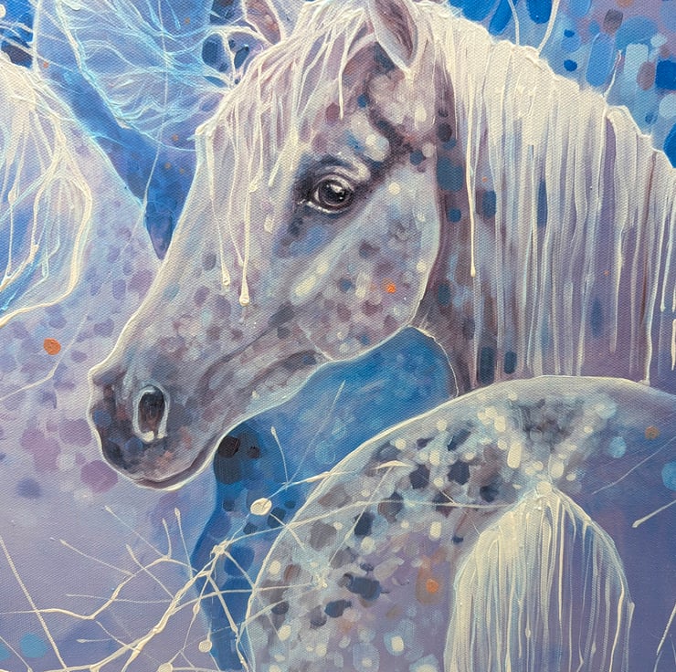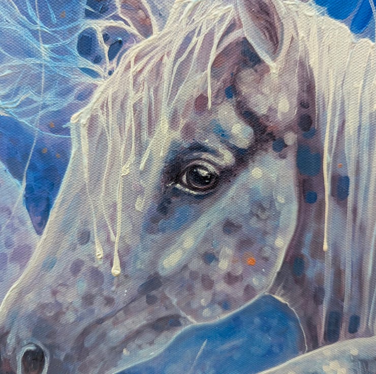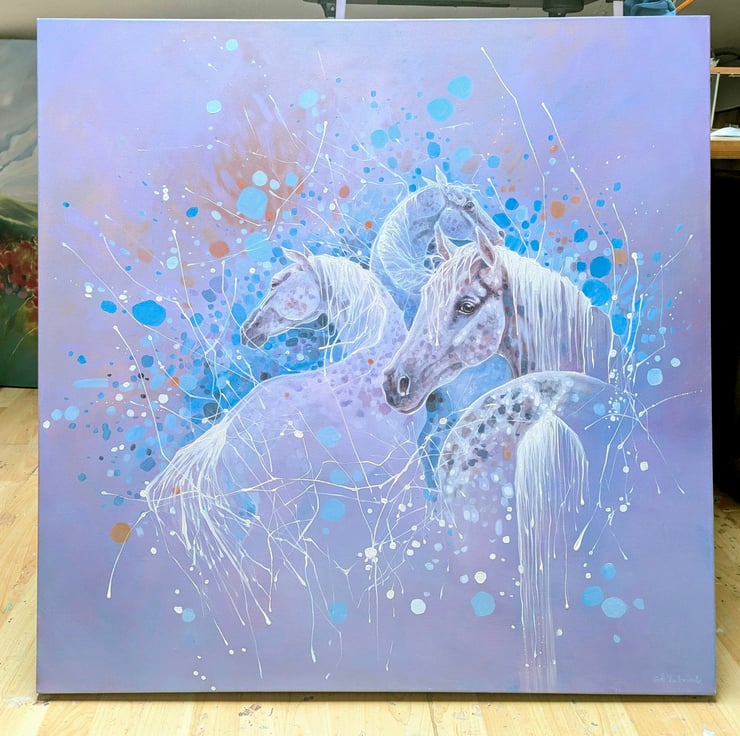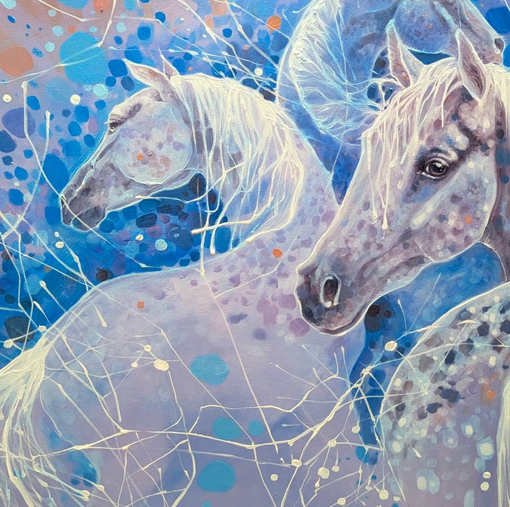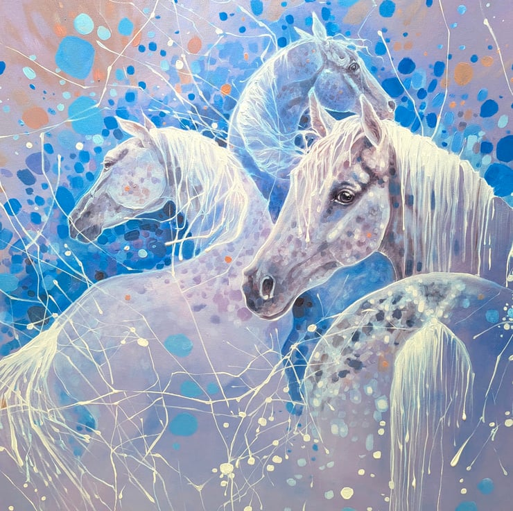 Equine Spell is a large expressive magical realism painting of white dappled Arabian horses. It is 36x35x1.5inches. The three horses merge into a purple and blue background and one looks back at the viewer with a question on her face. The inspiration for this painting is simply a desire to express how beautiful Arabian horses are. The horses themselves are caught in some kind of enchantment – hence the title. This painting is for those who are similarly captivated by the elegance of horses. Painted on deep edge canvas, edges purple blue, ready to hang and comes with certificate of authenticity.