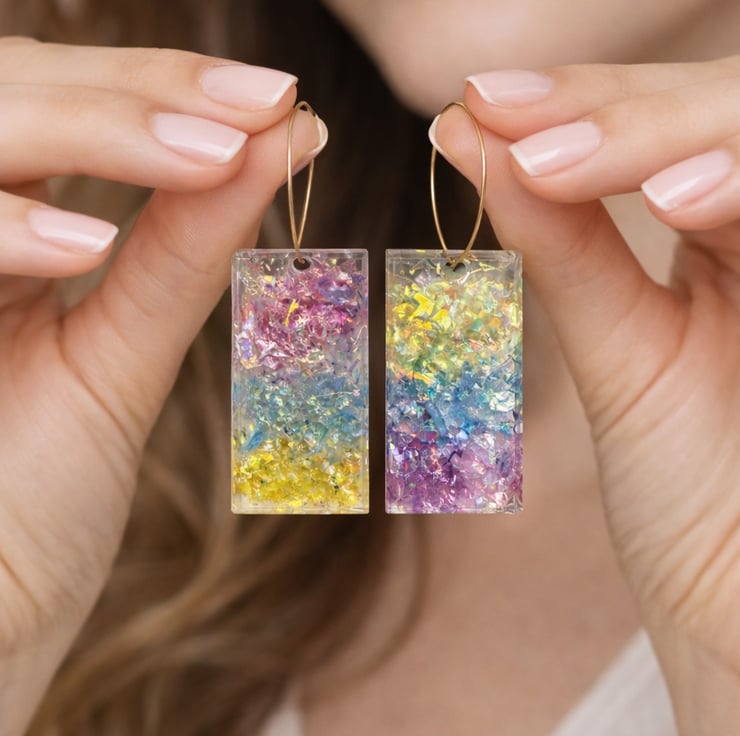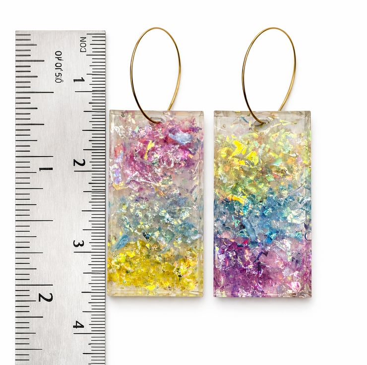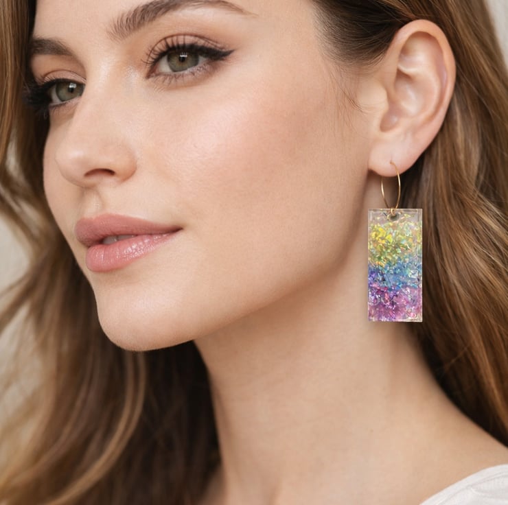 Add a pop of colour and sparkle to your look with these handmade rectangle resin glitter earrings, filled with a vibrant mix of purple, blue and yellow iridescent glitter shards suspended in crystal-clear resin. Designed to catch the light from every angle, these bold dangle earrings bring instant impact and a playful, modern feel.