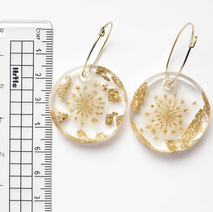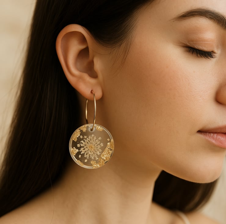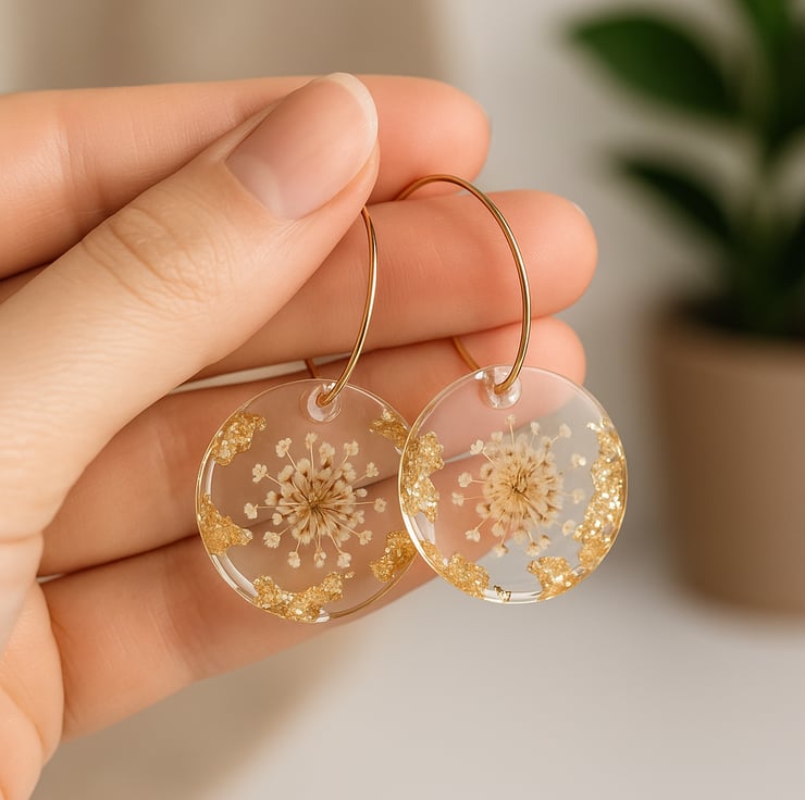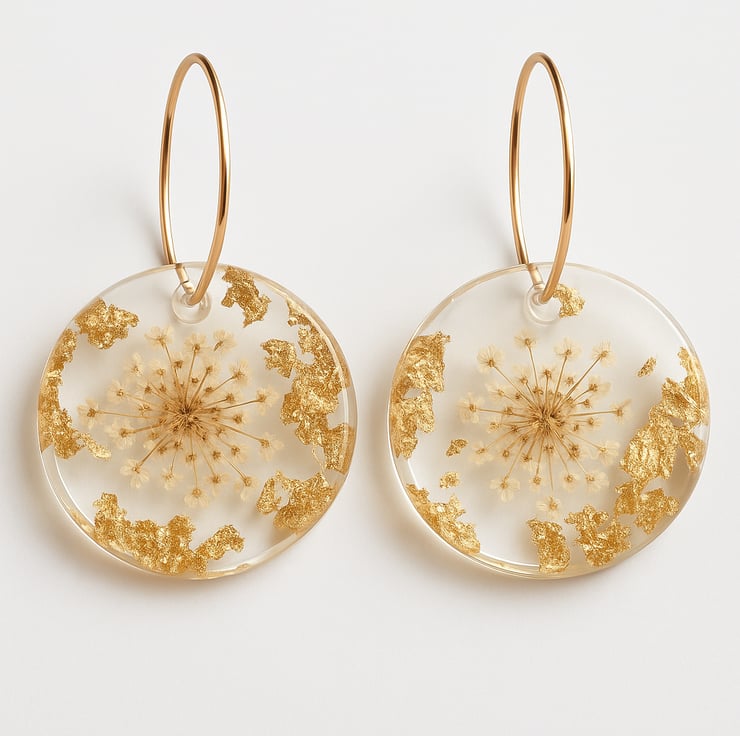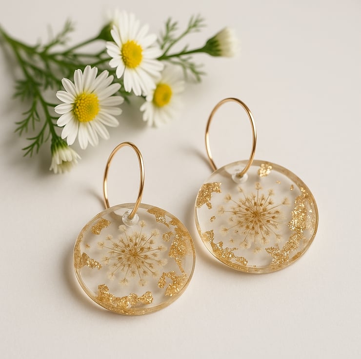 These handmade round resin hoop earrings feature real white flowers and delicate gold leaf flakes, beautifully preserved in crystal-clear resin. Their soft botanical detail and gentle golden shimmer create an elegant, nature-inspired look that suits both everyday wear and special occasions.