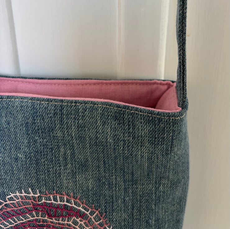 The main compartment and the zip pocket are lined with pink cotton, which reflects the colours of the embroidery on the front.