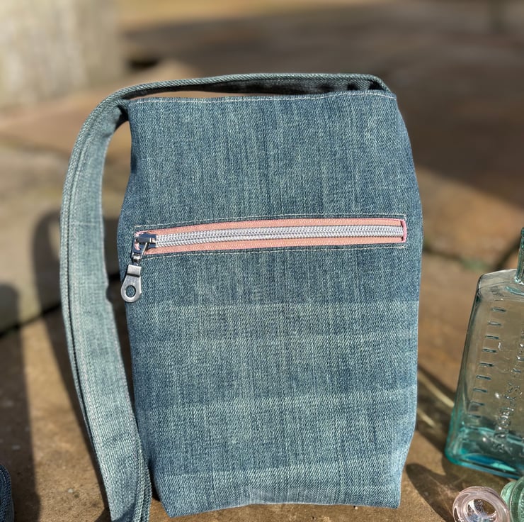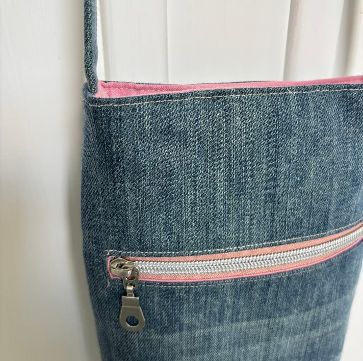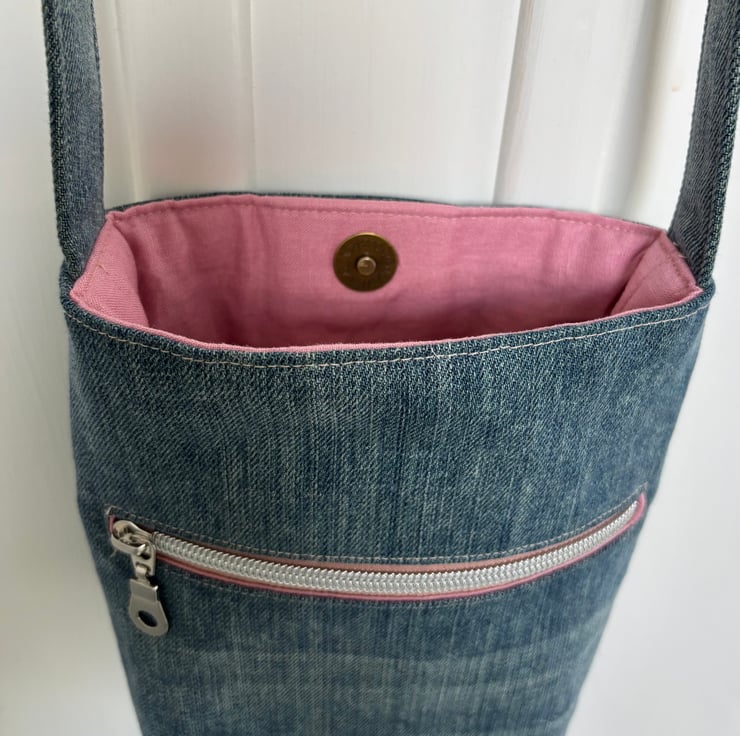 The bag has a zipper pocket on the reverse and the main compartment has a handy magnetic snap. The denim strap enables the bag either to becusedcasxa crossbody bag or shoulder bag - whichever you prefer.