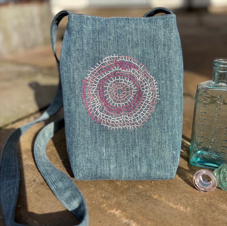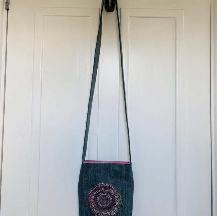 This upcycled denim crossbody bag is a great size for all your personal items when you’re out and about. The hand sewn embroidery motif makes this bag 100% unique and adds a level of interest which is only found in hand crafted items.
