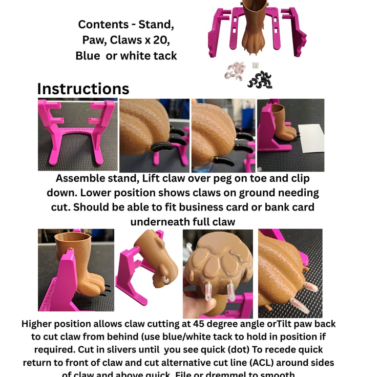 Your QuickClawz model is available in a variety of colours and will come with a mix of 20 clear and black claws with quicks. Claws will be available to purchase separately. The claws are a universal fit between the front and the dew claws allowing you to mix and match shapes and colours. The paw can be right or left sided. It has a non slip stand with two different heights. The lowest height with the claws on shows that the claws are too long and touching the ground. The model has to be moved up to the higher setting to practice cutting or removed from the stand. The paw only moves forward and back to mimic a real dog. Double click on the photo with Instructions above to view the full photo. l will be including these in the package for basic nail cutting and tips on how to recede the quick with an alternative cut line. The paw has a handy storage area for claws, dremmel, nail clippers etc.