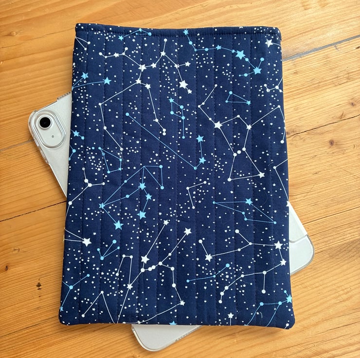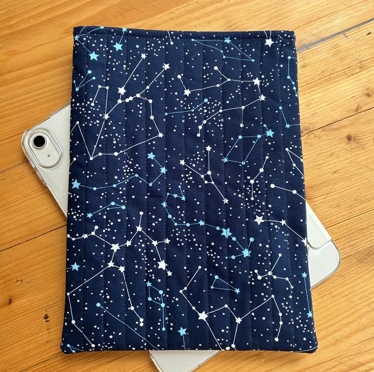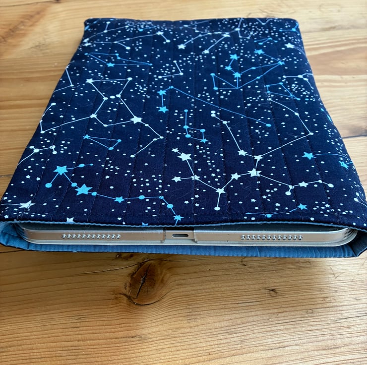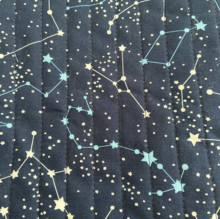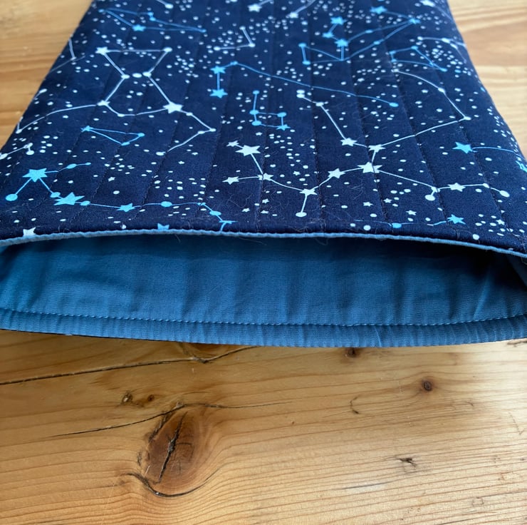 The sleeve is made in this striking constellation print fabric. The sleeve is quilted with navy blue stitching and is fully lined in plain mid blue cotton.