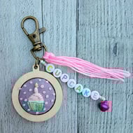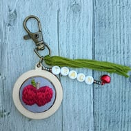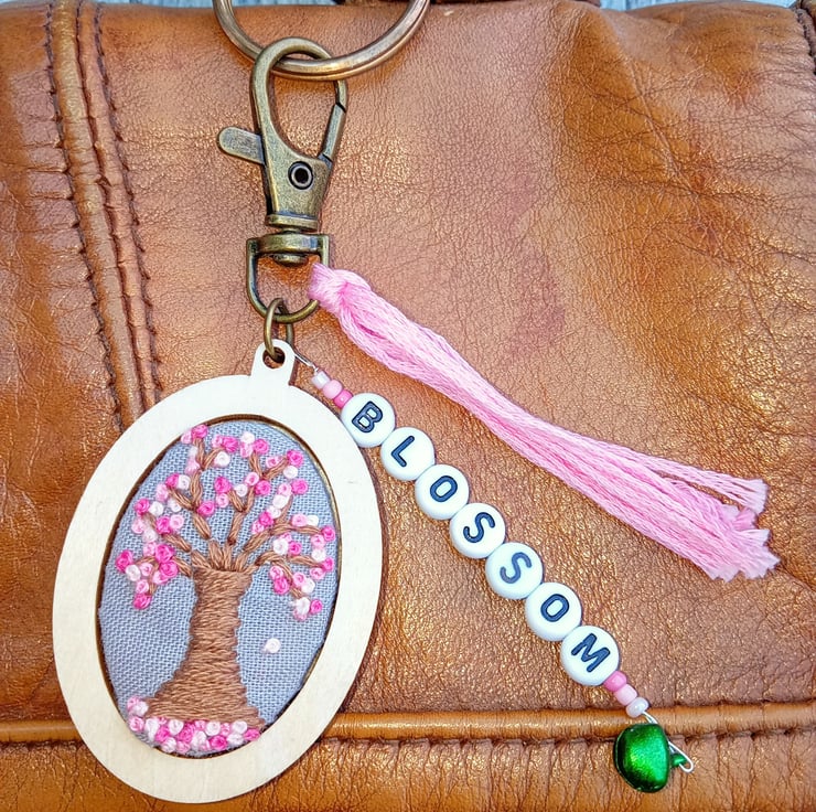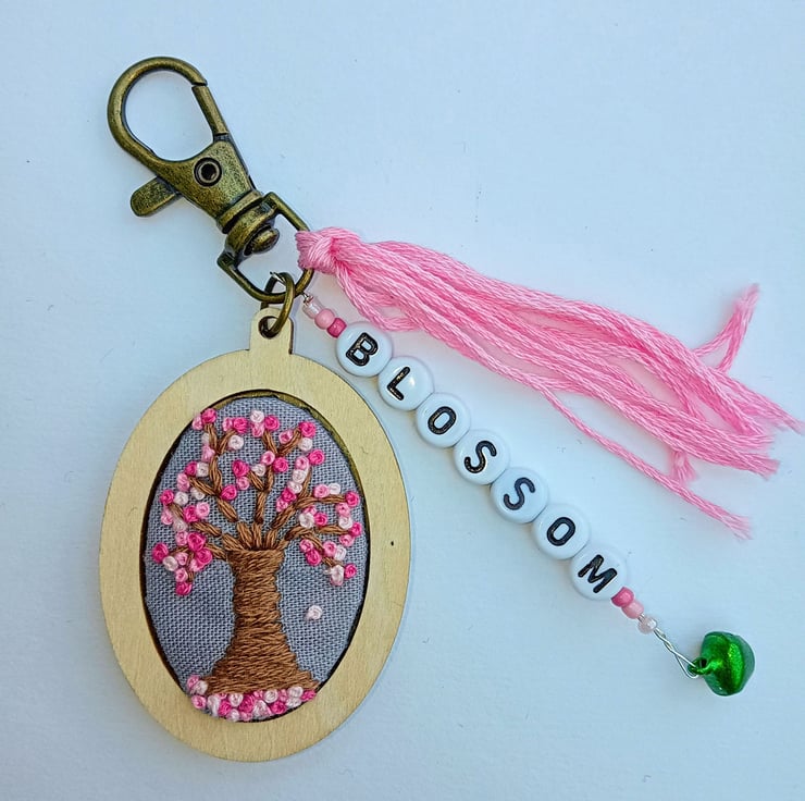 A hand embroidered spring blossom tree keyring/bag charm with the word ‘blossom’ in black letter beads, adorned with coloured beads and a little bell, finished with a pink tassel.