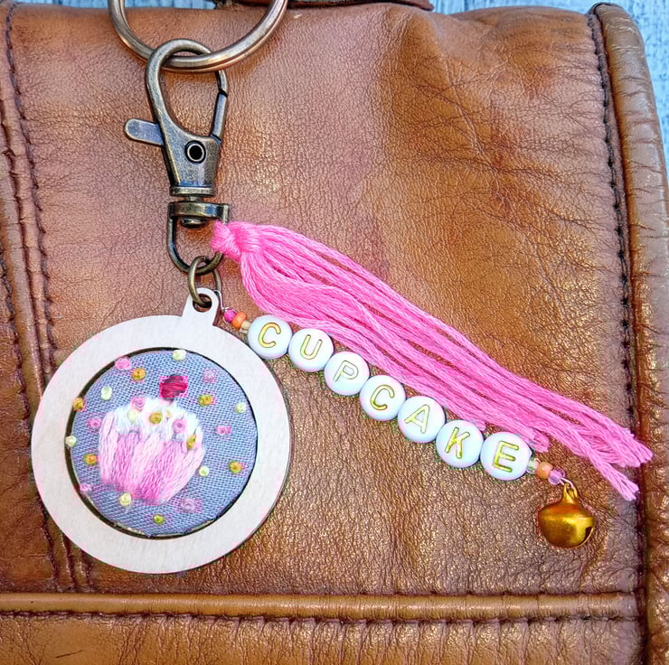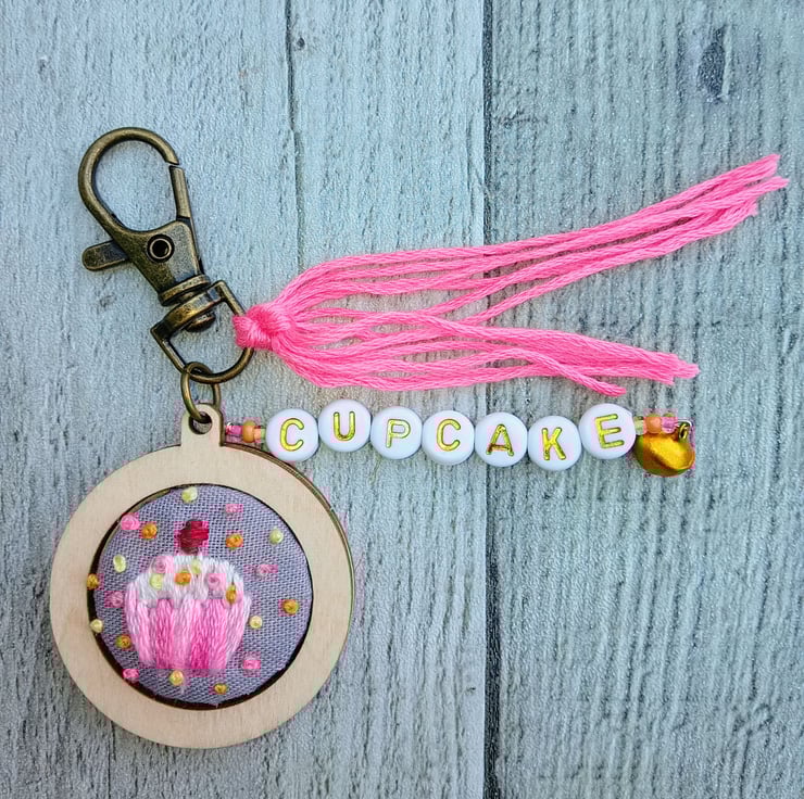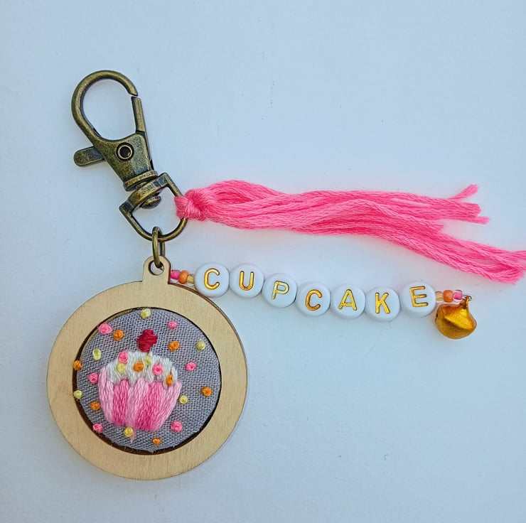 A hand embroidered cupcake keyring/bag charm with the word ‘cupcake’ in gold letter beads, adorned with coloured beads and a little bell, finished with a pink tassel.