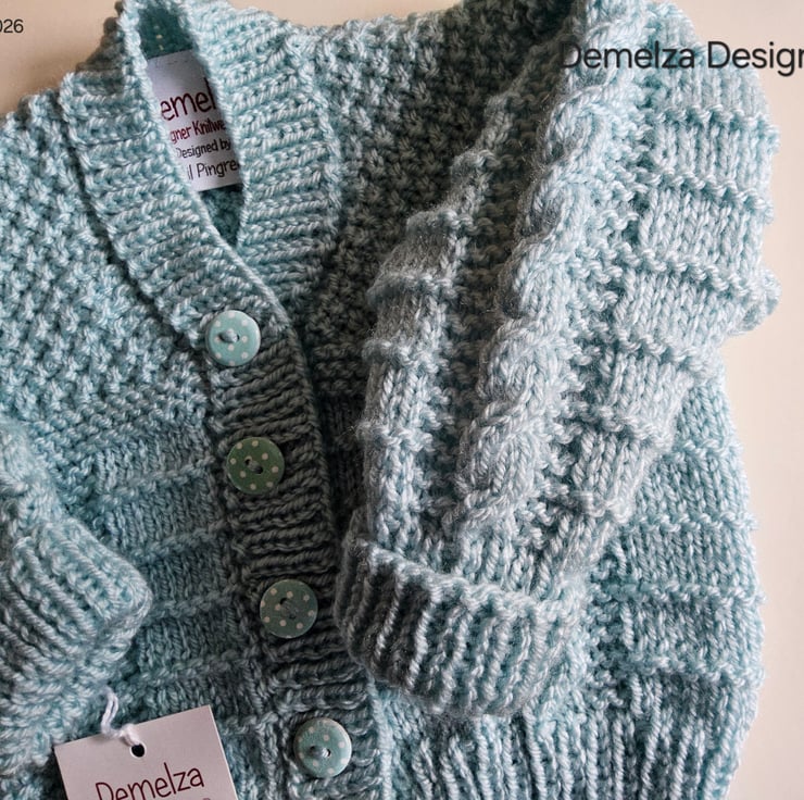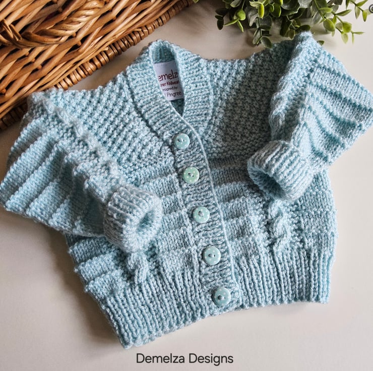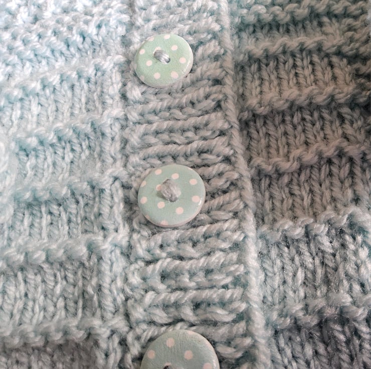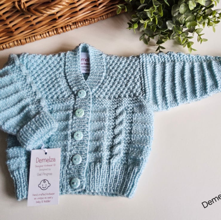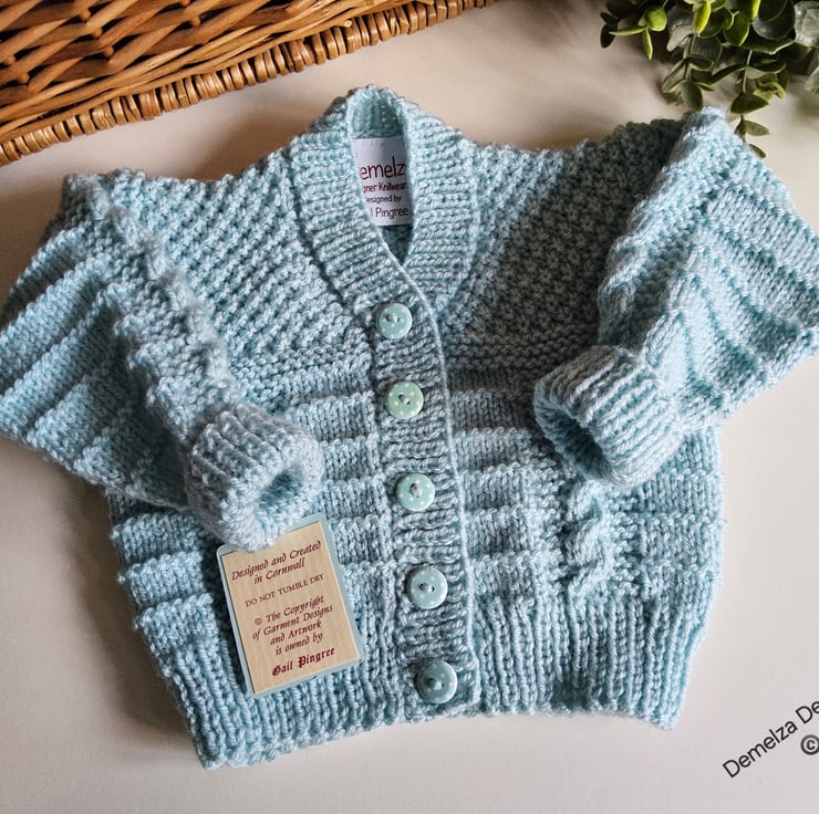 A unique eye catching practical baby boy's cardigan designed and totally hand crafted in Cornwall using quality premium branded acrylic machine washable yarns. The branded soft damask Demelza Designs garment label is attached to the back neck edge with the care instructions woven within it on the reverse side for lasting reference. The buttons are made from genuine wood with a delicate polkadot design on them.
