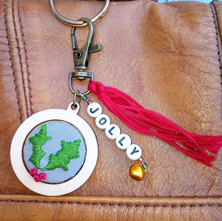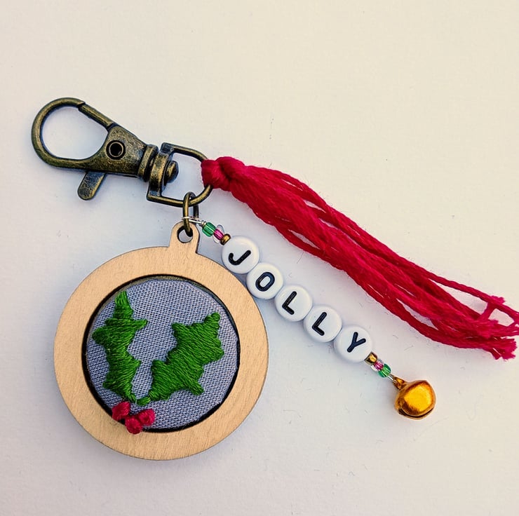 A hand embroidered holly keyring/bag charm with the word ‘jolly’ in black letter beads, adorned with coloured beads and a little bell, finished with a red tassel.