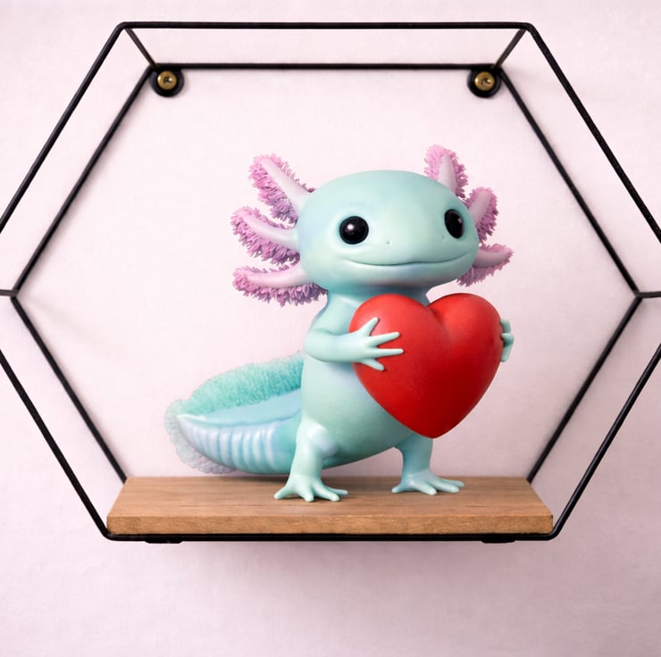 This adorable axolotl sculpture holding a heart is a charming decorative piece, perfect for gifts, bedrooms, desks, shelves or special occasions. With its cute expression, detailed frilled gills and smooth sculpted finish, it brings warmth and personality to any space.