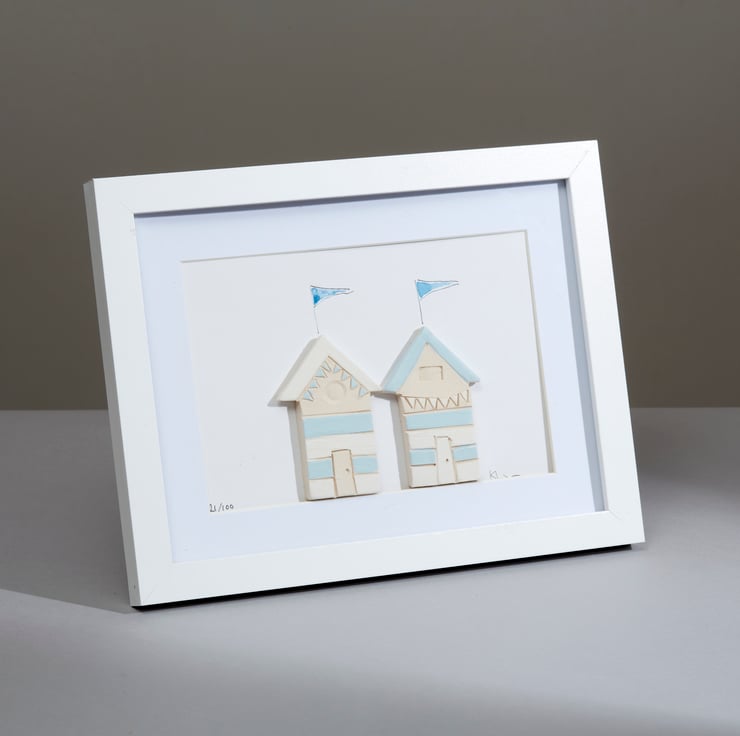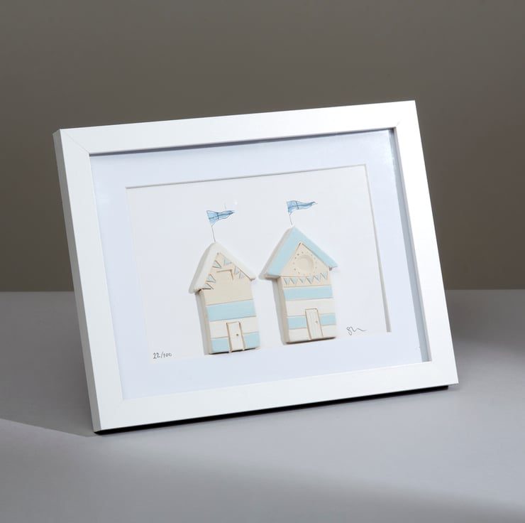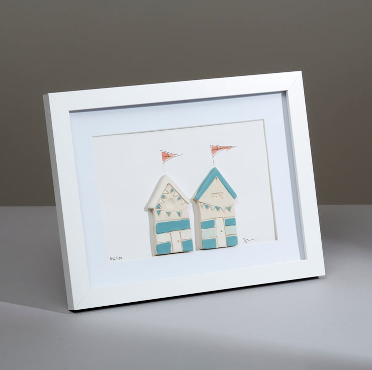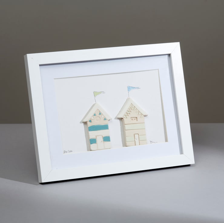 These are a limited edition, charming, handmade, framed pair of ceramic beach huts. Each one is an individual piece. Framed in a white frame with painted water colour flags.