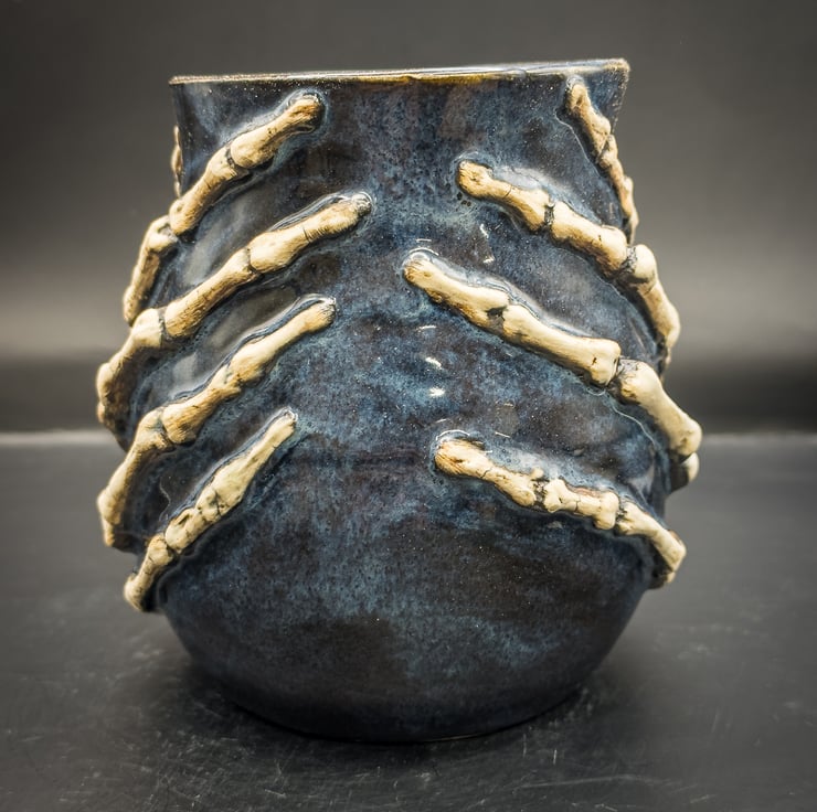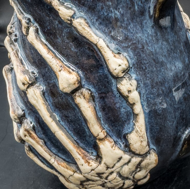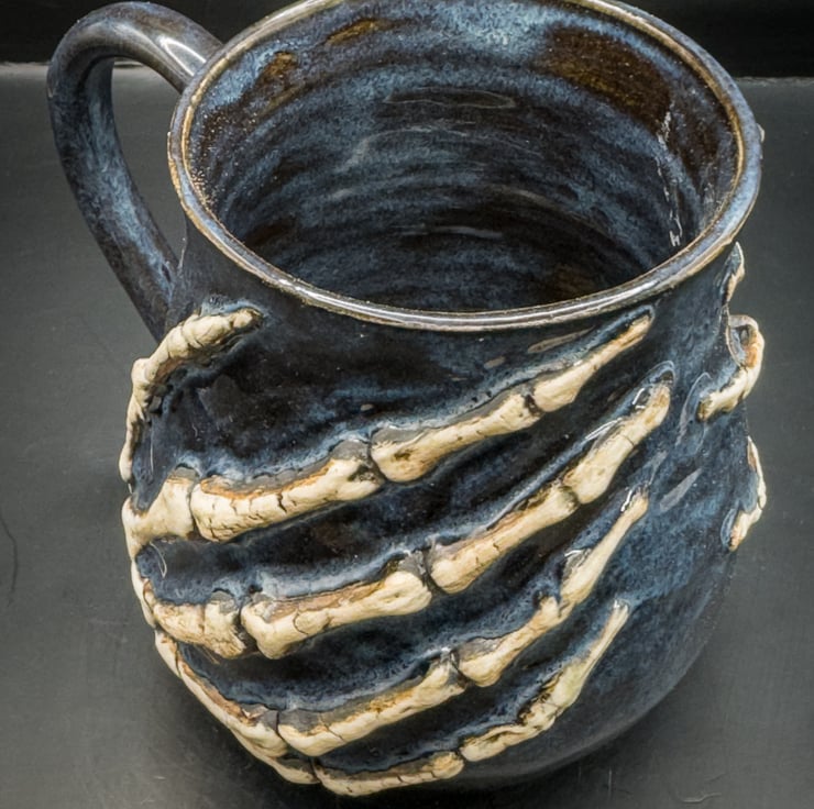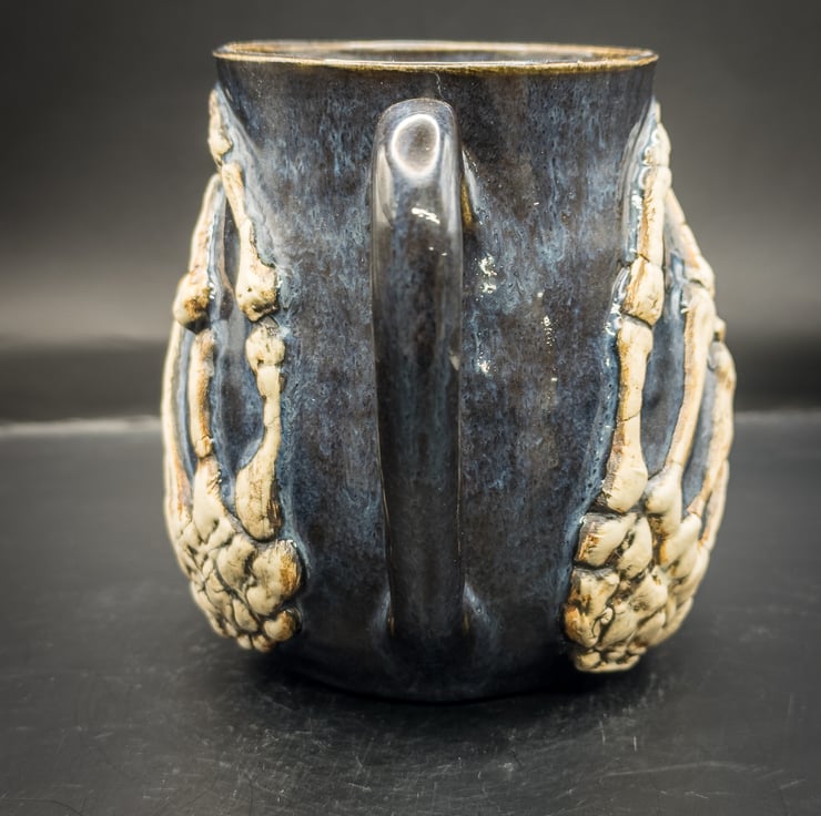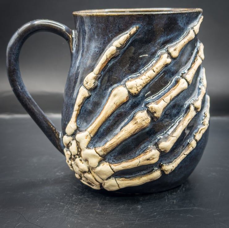 I love making these mugs, it's a large handmade skeleton coffee mug with two sculpted bone hands. It's about 13cm tall and 10cm wide with a dark blue/black glaze and bone white for the skeleton. Dishwasher safe.