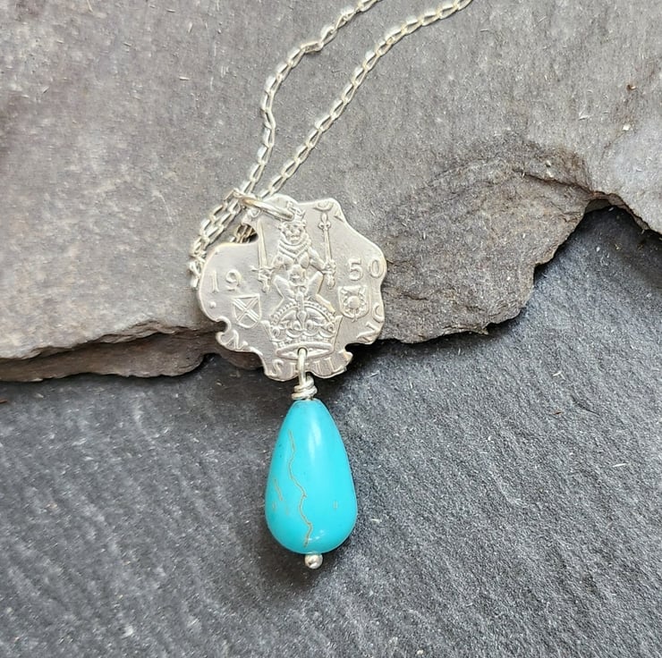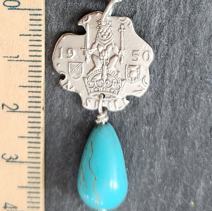 A 1950 shilling coin cut into an abstract shape (or is it a cloud?) with a teardrop shaped magnesite stone which I see as a raindrop. A drop of approximately 4cms.