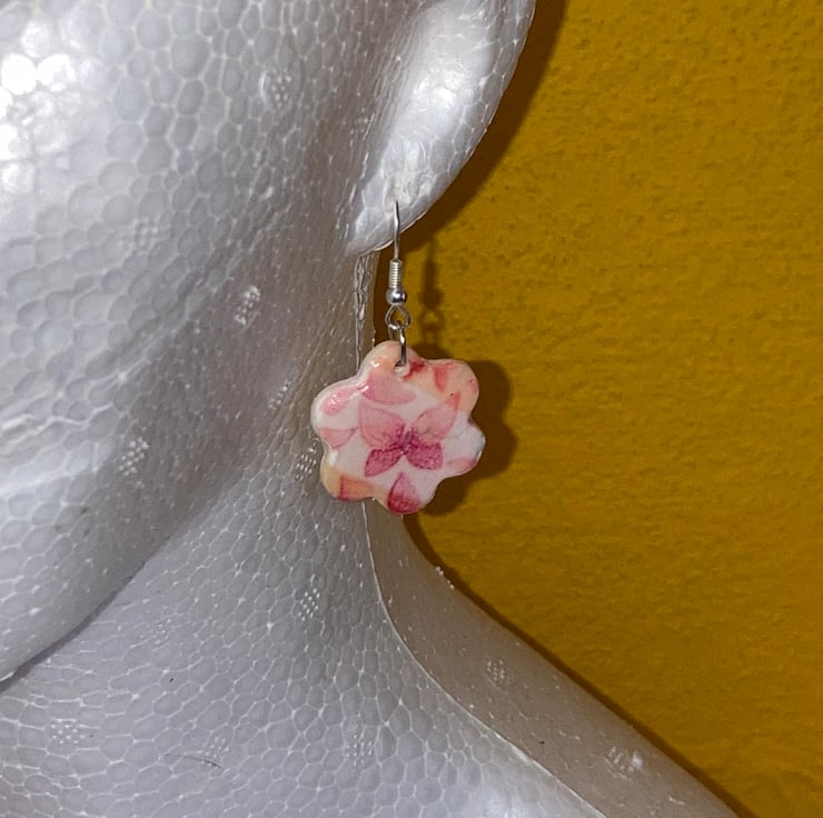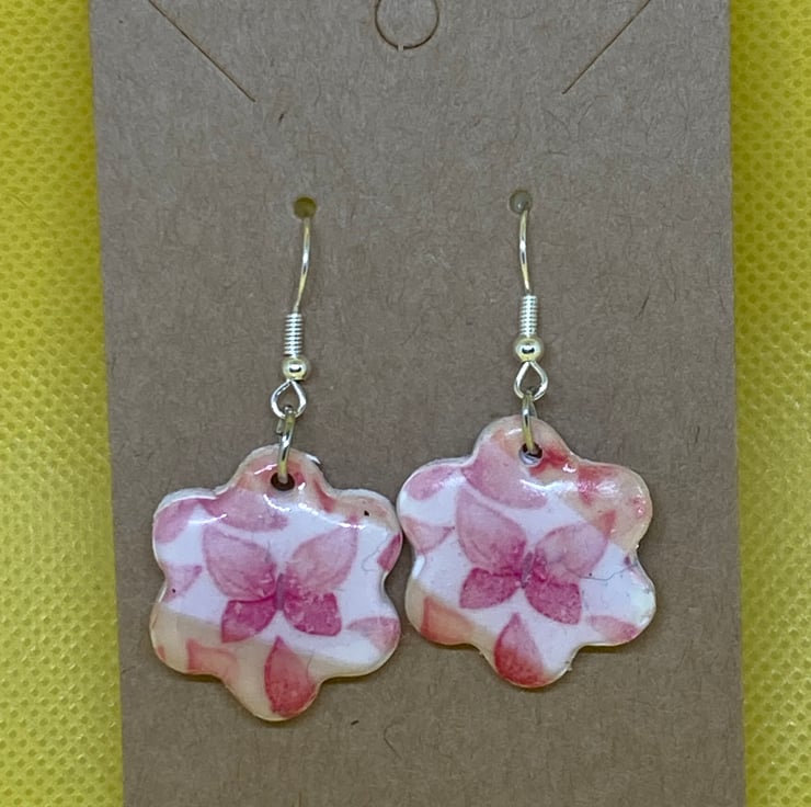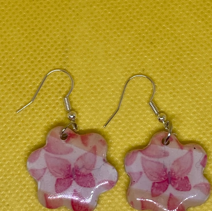 The flower charm is approximately 2.5 cm in diameter. They have been made in white and peach polymer clay and then a pink butterfly image has been applied. I have then sealed them with resin with a hypoallergenic hook.