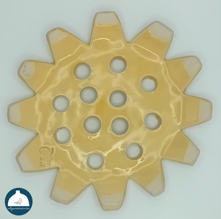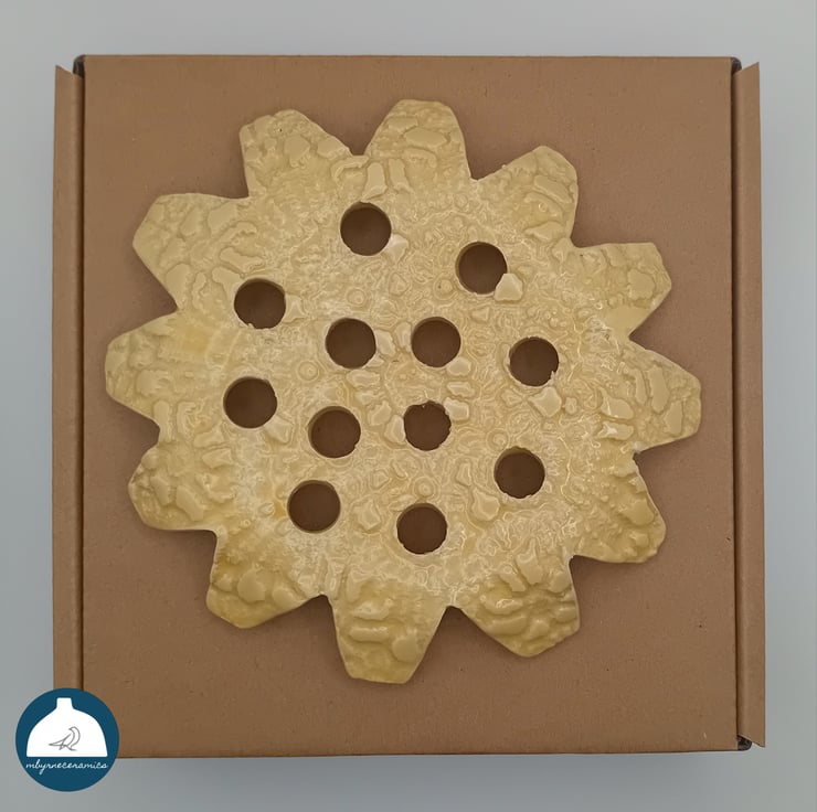 A beautiful lace imprinted ceramic flower frog in a lovely yellow colour handmade by me. This is the perfect gift for anyone who receives or arranges flowers. Simply place the flower frog on top of a glass/mug/vase or set inside a bowl or dish and then add your flowers or foilage. Each flower frog has 11/12 holes in to which the flower stem is inserted. This helps support the flowers and stop them from splaying. It is a perfect replacement for floristry foam and a great solution to a cupboard full of vases, this covers it all. Also available in purple and aqua in separate listing's.