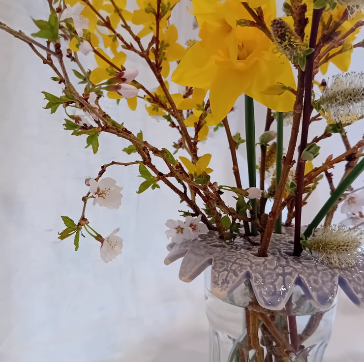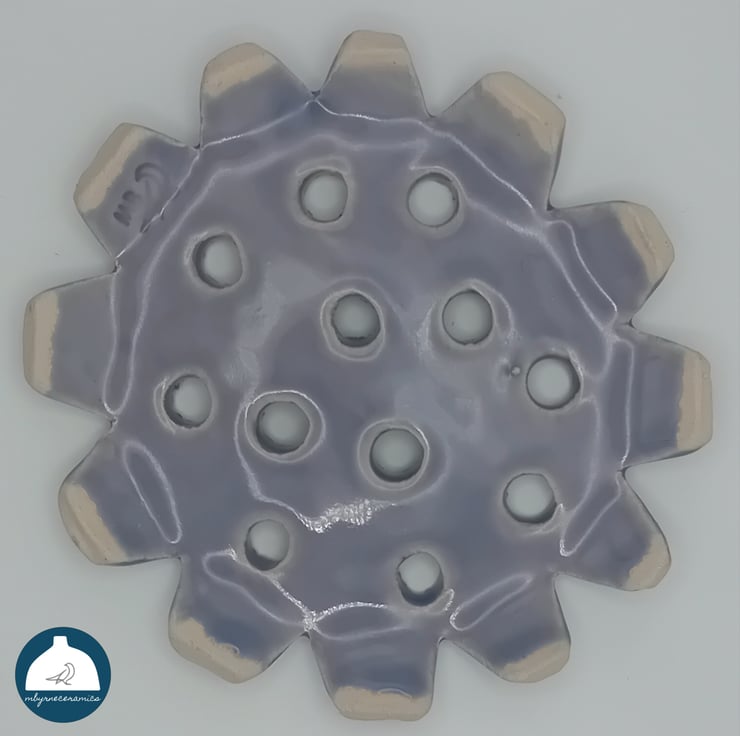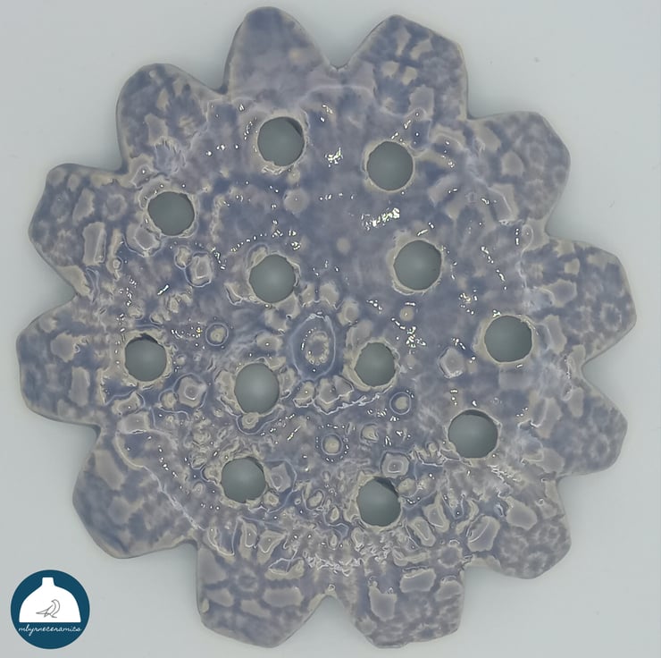 A beautiful lace imprinted ceramic flower frog in a lovely purple colour handmade by me. This is the perfect gift for anyone who receives or arranges flowers. Simply place the flower frog on top of a glass/mug/vase or set inside a bowl or dish and then add your flowers or foilage. Each flower frog has 11/12 holes in to which the flower stem is inserted. This helps support the flowers and stop them from splaying. It is a perfect replacement for floristry foam and a great solution to a cupboard full of vases, this covers it all. Also available in aqua and yellow in separate listing's.