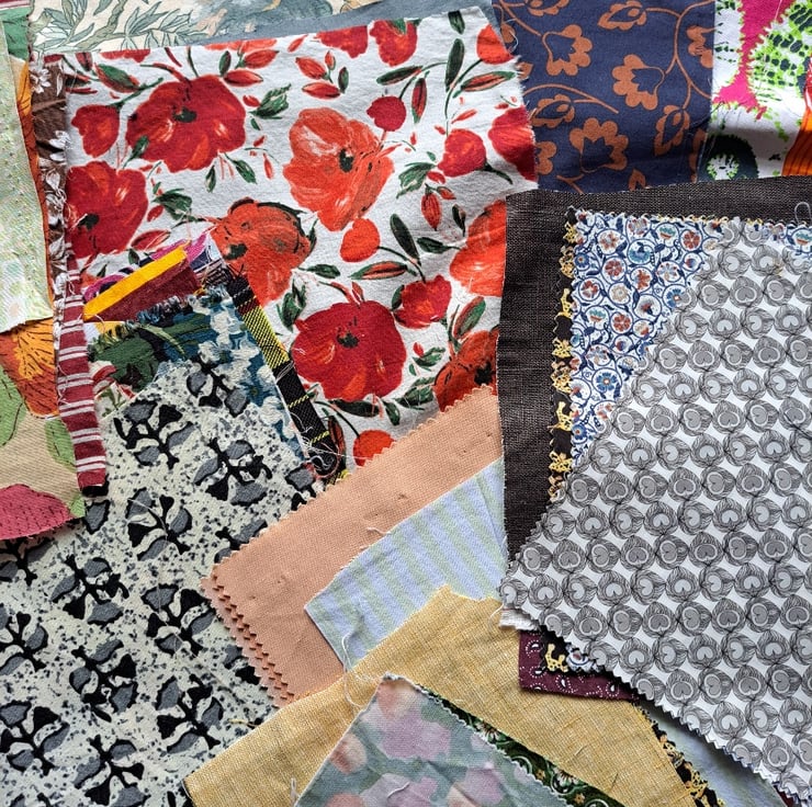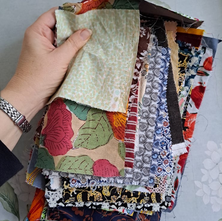 This bundle is the accumulation of all those middling sized bits of fabric that are neither fat quarters nor cute scraps. There's so much loveliness here: more than 50 pieces of new, remnant, repurposed and vintage cotton and linen (maybe two viscose) and includes some real gems, such as Liberty samples and vintage florals. The biggest is a not inconsiderable 45cm by 15cm and the smallest 14cm squared. What a fabulous bundle.