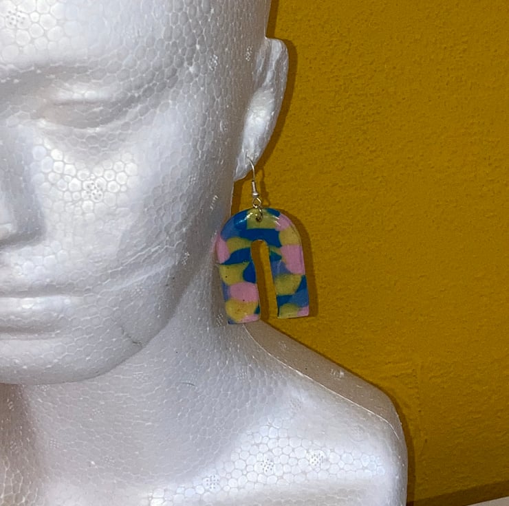 Handmade polymer clay arch-shaped drop earrings featuring a marbled colourful design.
