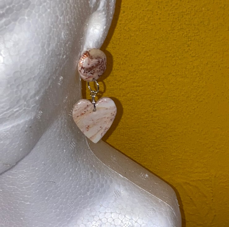 Handmade polymer clay earrings featuring a marbled, rose-gold shimmer design. They are crafted to resemble gemstones. They have a hypoallergenic straight post with butterfly back with large jump rings so the hearts can dangle
