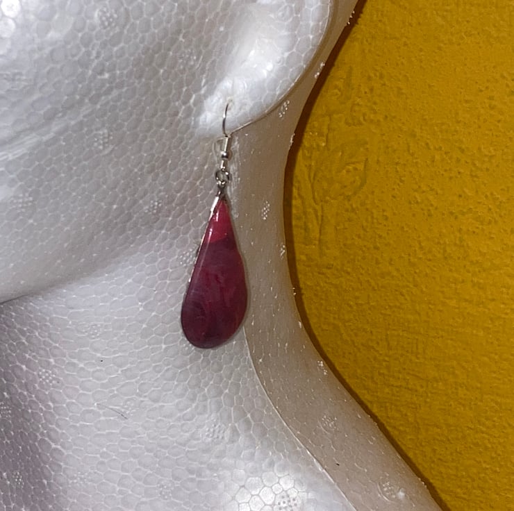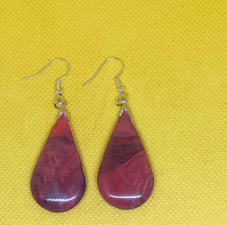The teardrop design earrings measure approximately 5cm. They have been made using a silver metal frame filled in with a marbled polymer clay, which has then had a few layers of resin. This has made them look more like a stone.