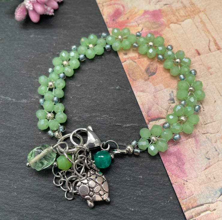 Adding a playful, personal touch, a cluster of charms dangles from the clasp — including a silver-tone heart charm and coordinating green glass beads that echo the bracelet’s colour palette. The movement of the charms adds character and a hint of whimsy.