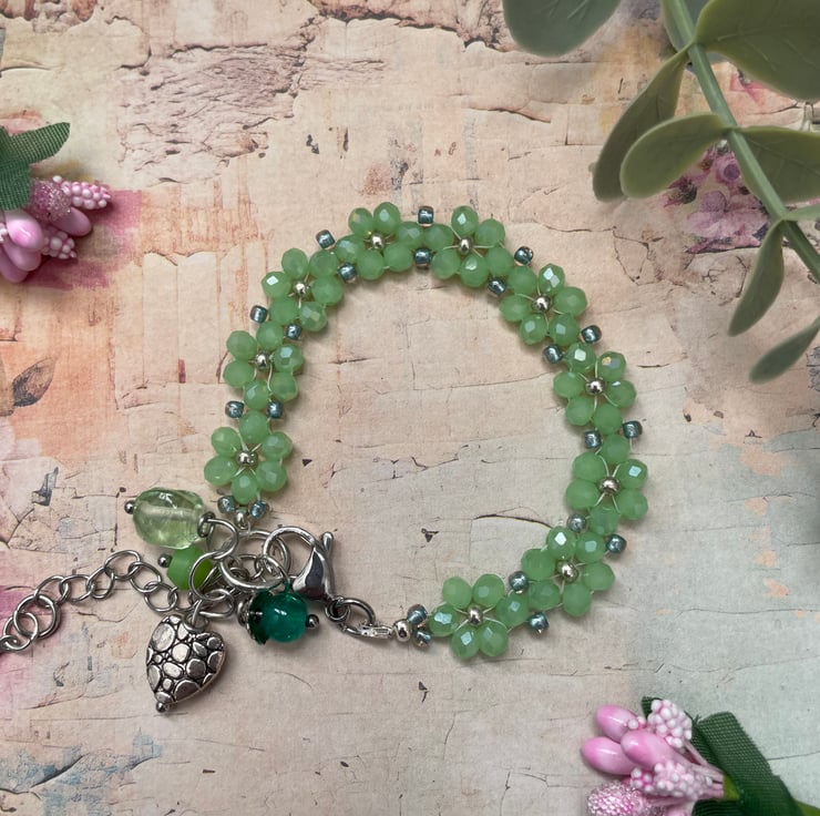 This handmade beaded bracelet is a fresh and elegant piece inspired by nature’s soft green tones. It features faceted light-green beads arranged in delicate flower clusters, each blossom accented with tiny metallic spacer beads that add subtle shimmer and definition.